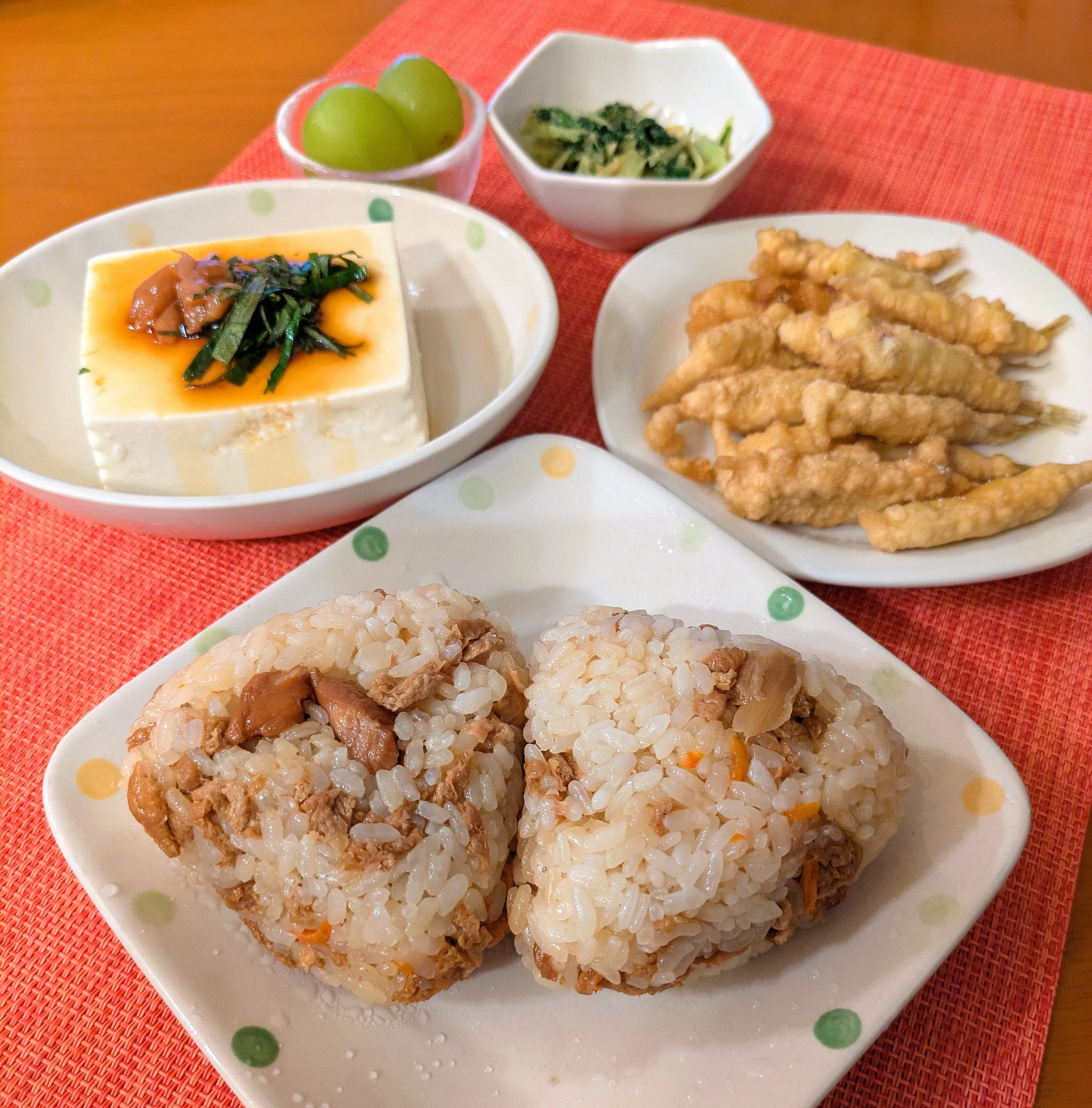 #夕食#大分#かしわめし#わかさぎ#天ぷら#冷奴#辛子和え#シャインマスカット