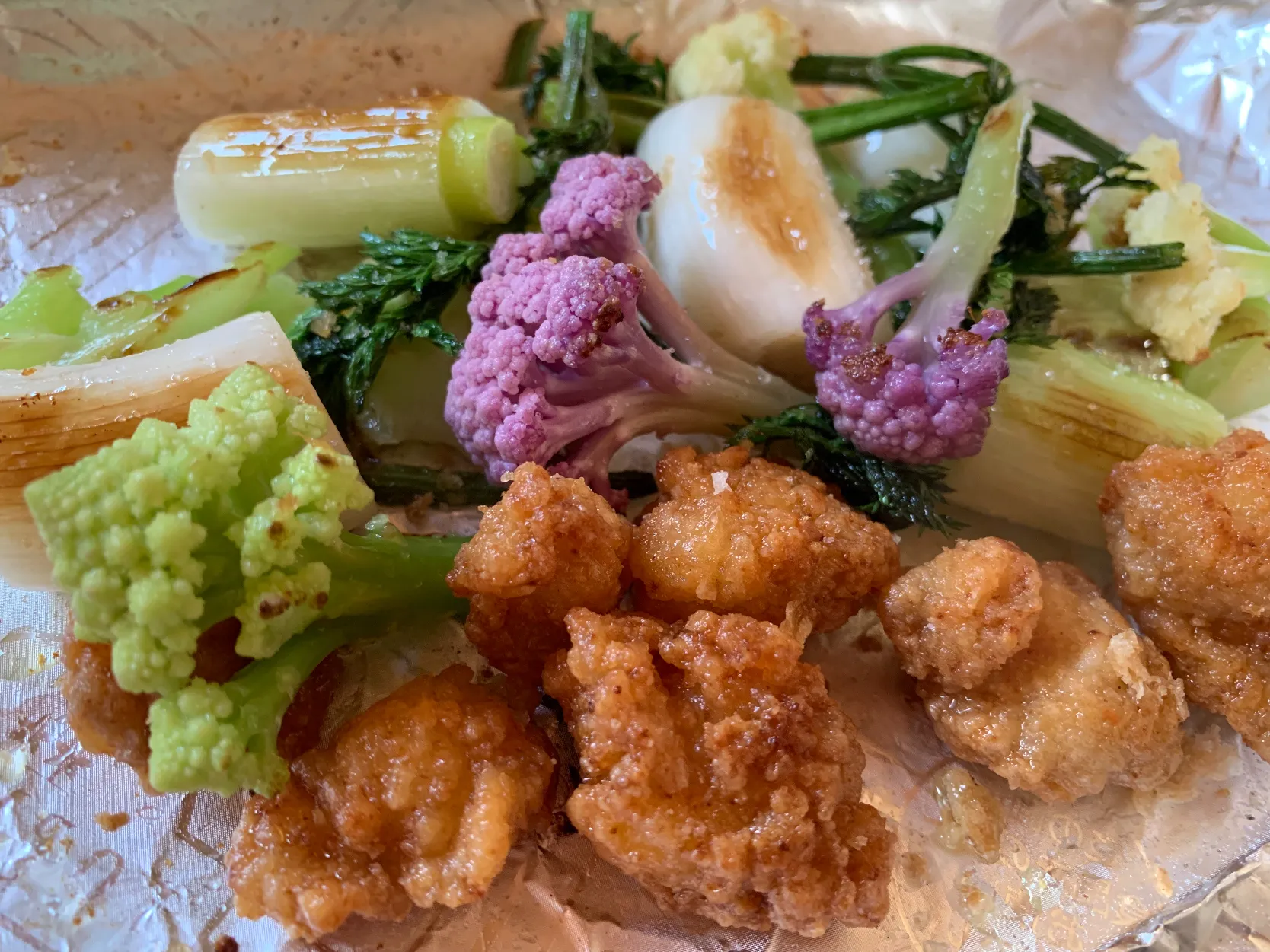 味のちぬやさんのなんこつ唐揚げ、ねぎ、カリフローレ、にんじんの葉をじっくり焼く。