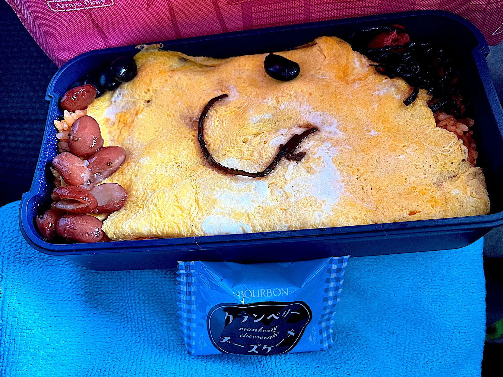 #昼飯 黒豆4個茶豆7個と梅乗せ豆としそ昆布の天パー顔オムライスクランベリーチーズケーキ添え弁当