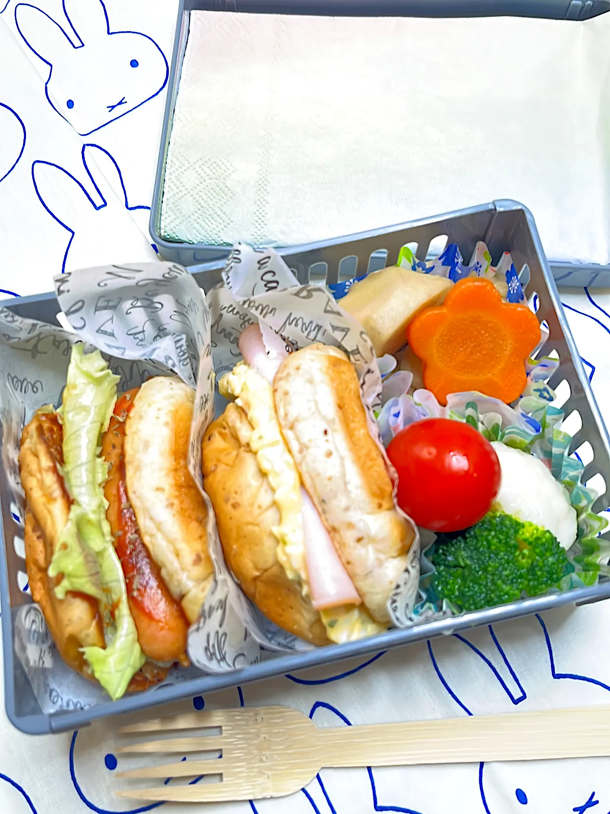 サンドイッチ(玉子&ハム、ウインナー&チーズ&レタス)、里芋人参白滝の煮物、カリフラワーブロッコリーのレモンマリネ、ミニトマト