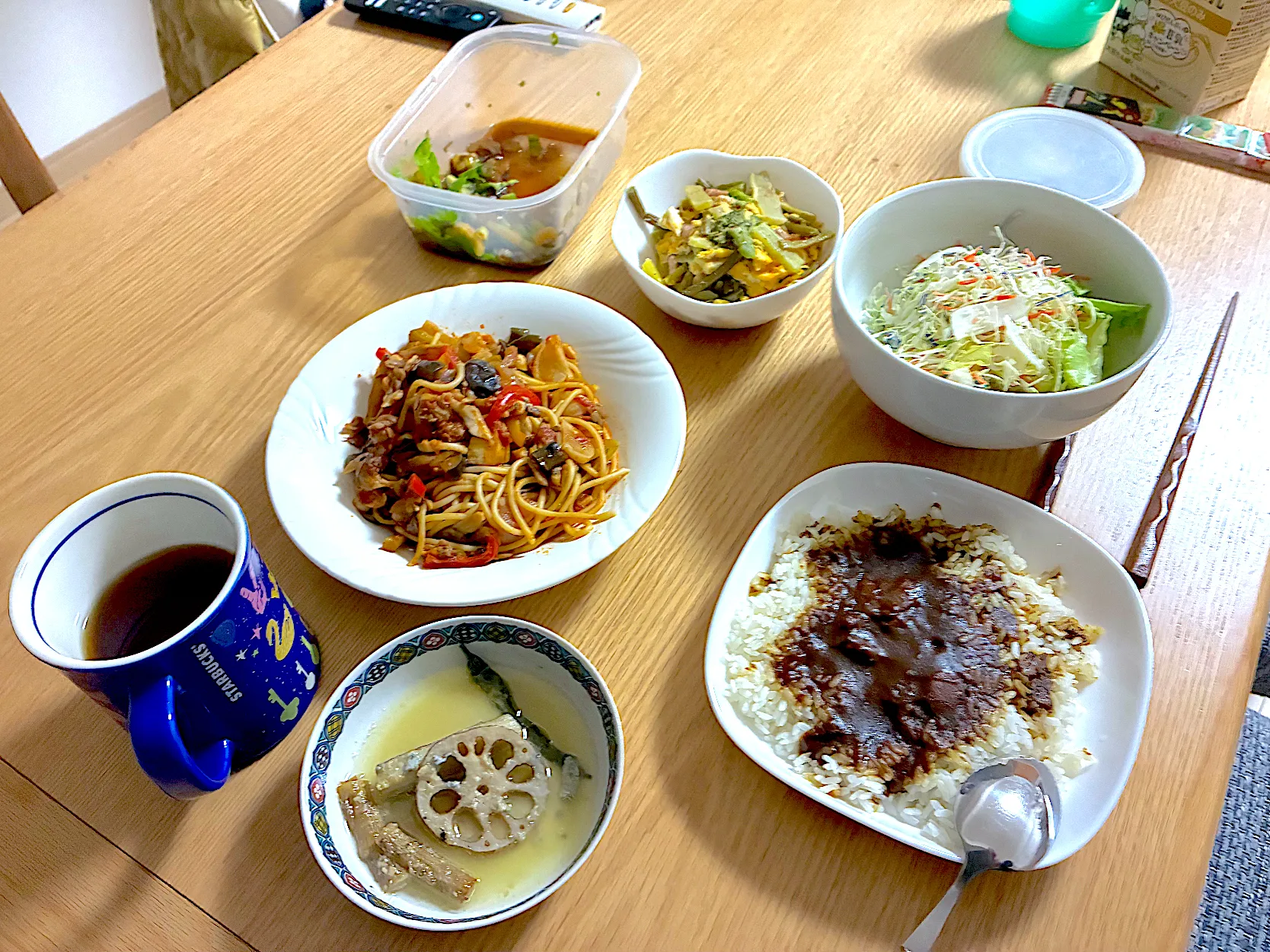 玉子とにんにくの芽のスイートチリソース炒め、グリーンサラダ、チキンカレー、シーフードミックスと茄子とパプリカのトマトパスタ、ごぼうと蓮根のガーリックブルーチーズ焼き、イカくんセロリ。