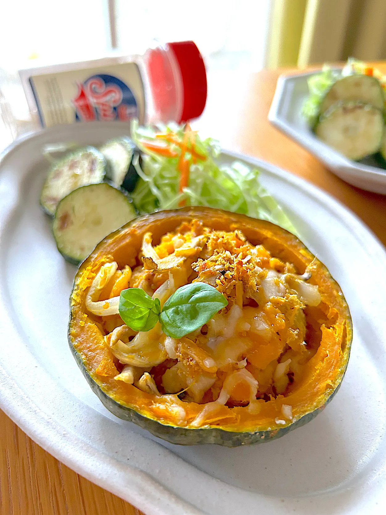玉ねぎ、舞茸、ベーコン、くり抜いたかぼちゃの中身をスパイス21で炒めて