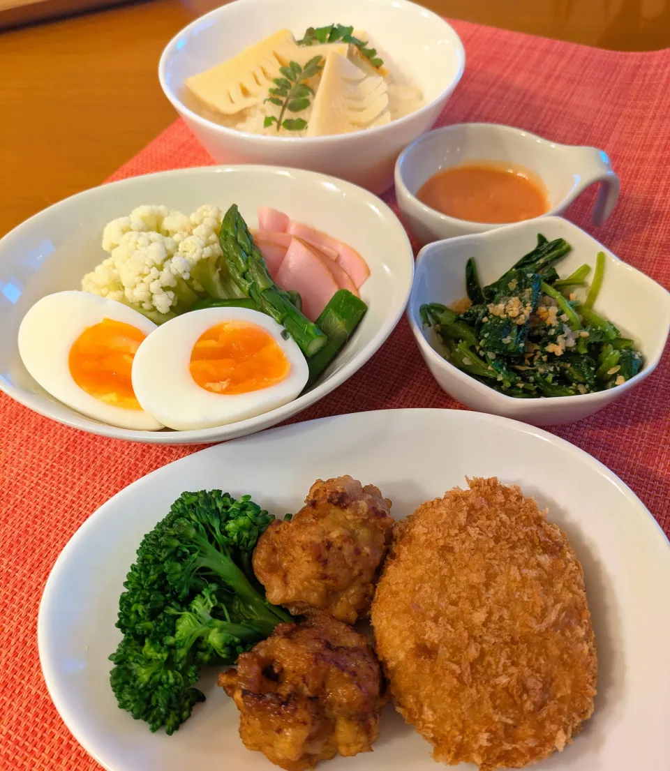 #夕食#豚天#おからコロッケ#サラダ#ピーナッツ和え#タケノコ#ご飯