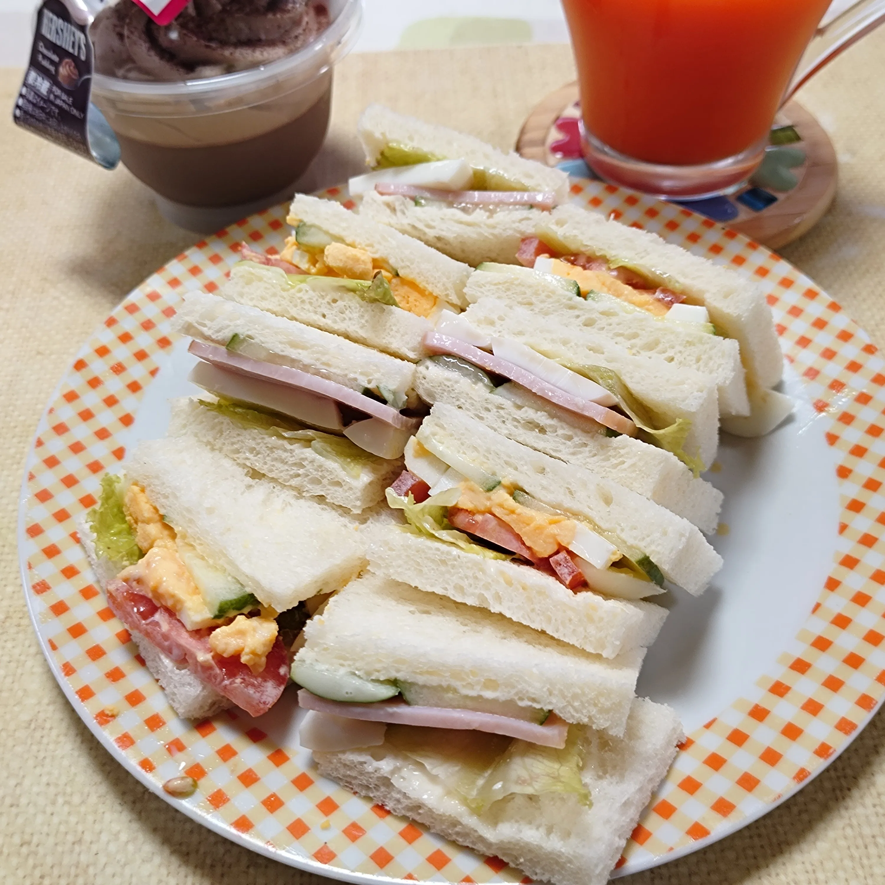 #サンドイッチ#野菜ジュース#ハムサンド#ミックスサンド#チョコプリン