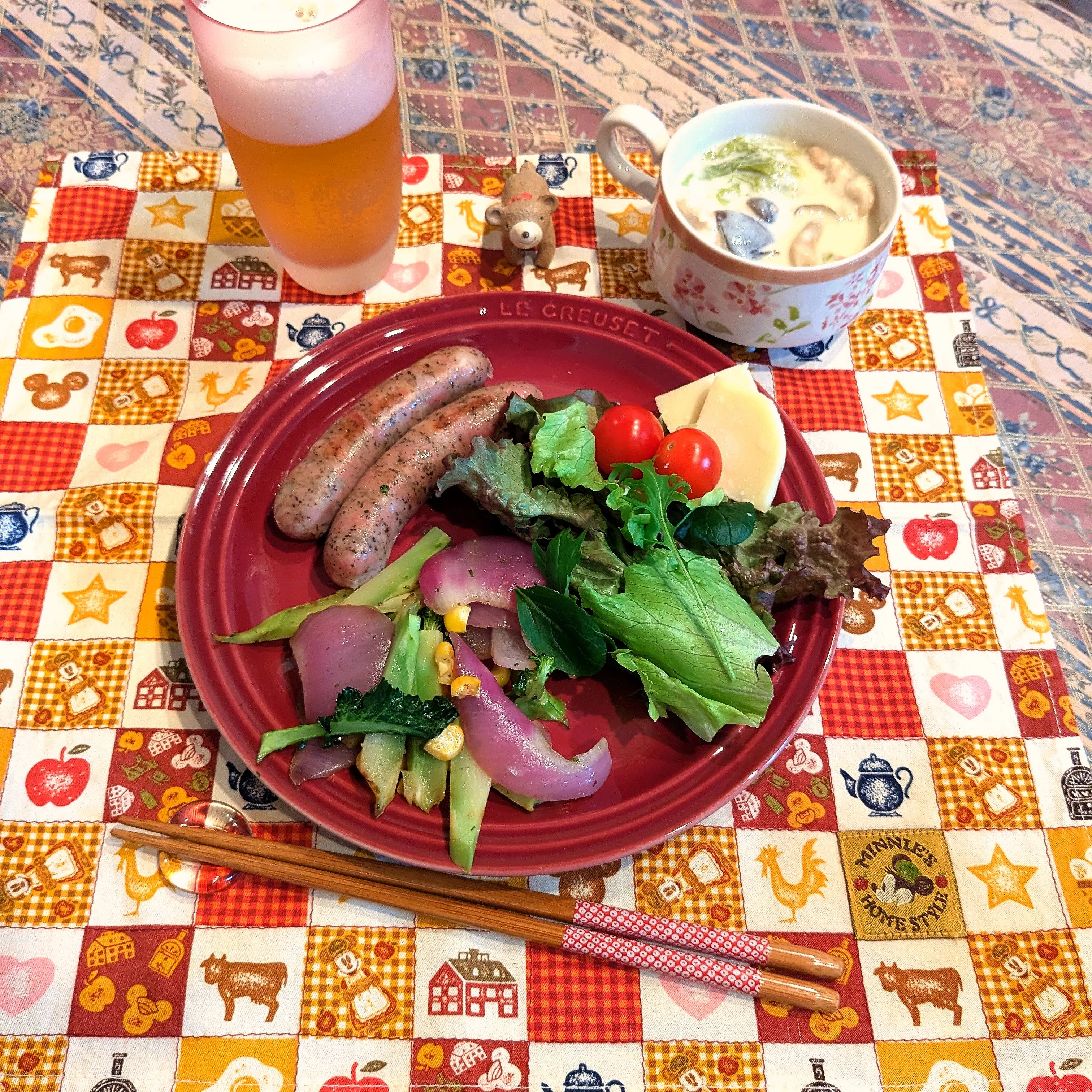鶏肉ときのこと山東菜のクリーム煮、ブラックペッパー粗挽きソーセージ、紫玉ねぎとブロッコリーの芯とコーンのハーブソルト炒め、お野菜、チーズ、ミニトマト、🍺