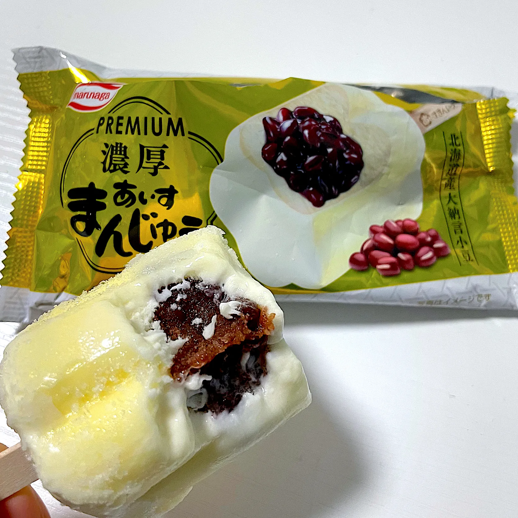 乳脂肪分が低めのミルクアイスはサクッとした水分感があったりするけれど、それは全く感じられず、とにかくねっとり濃厚でとろける舌触り。シャトレーゼのミルク饅頭っぽい食感かも。まるで練乳のようなコクのある甘さとまろやかさ。色もいつもより黄色味が強い。小豆あんはふっくらとした上品な甘さの北海道産大納言小豆を使用しているみたい。ミルクアイスがいつもよりも甘いからか、小豆あんは上品な甘さに感じた。いつもの方はミルクアイスよりもずっと甘くて小豆あんが主役って感じだけど、今回はミルクアイスがすごく目立っている感じ。いつものとの違いを楽しめて満足。