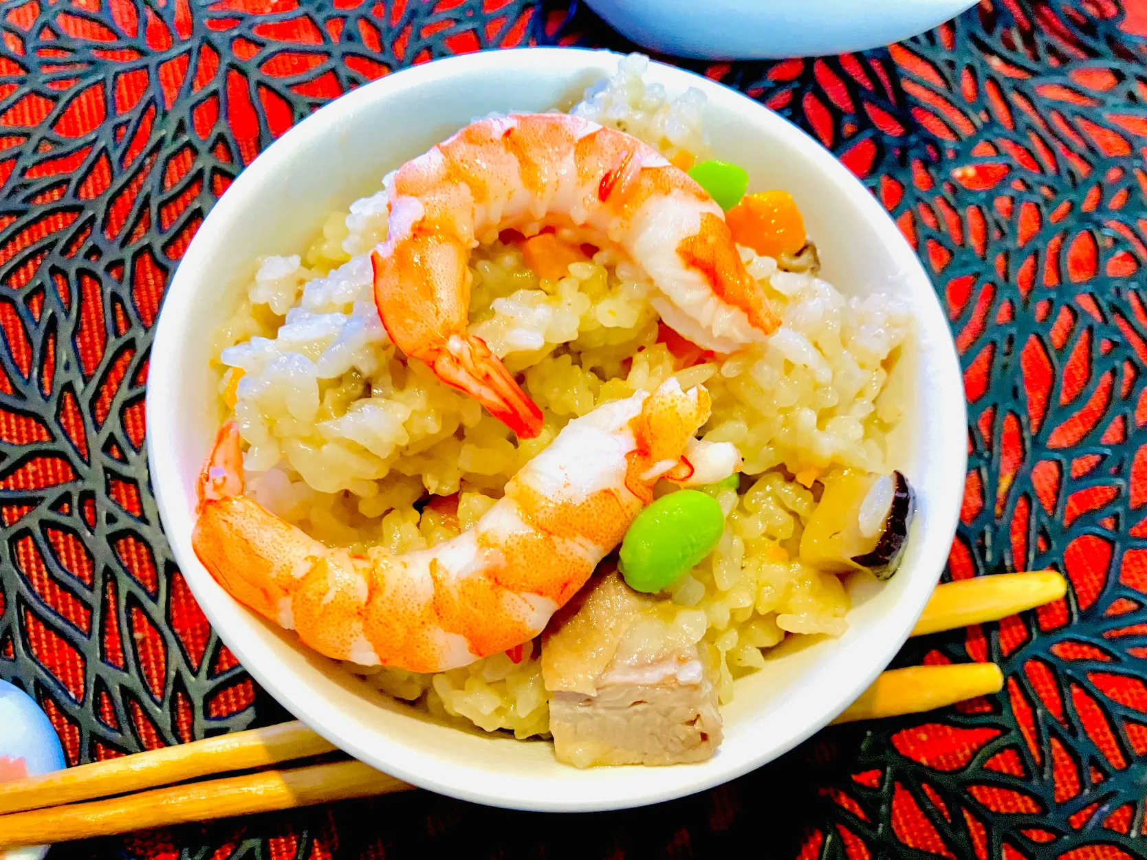 #米 #もち #しいたけ #にんじん #枝豆 #角煮 #海老 #角煮のタレ