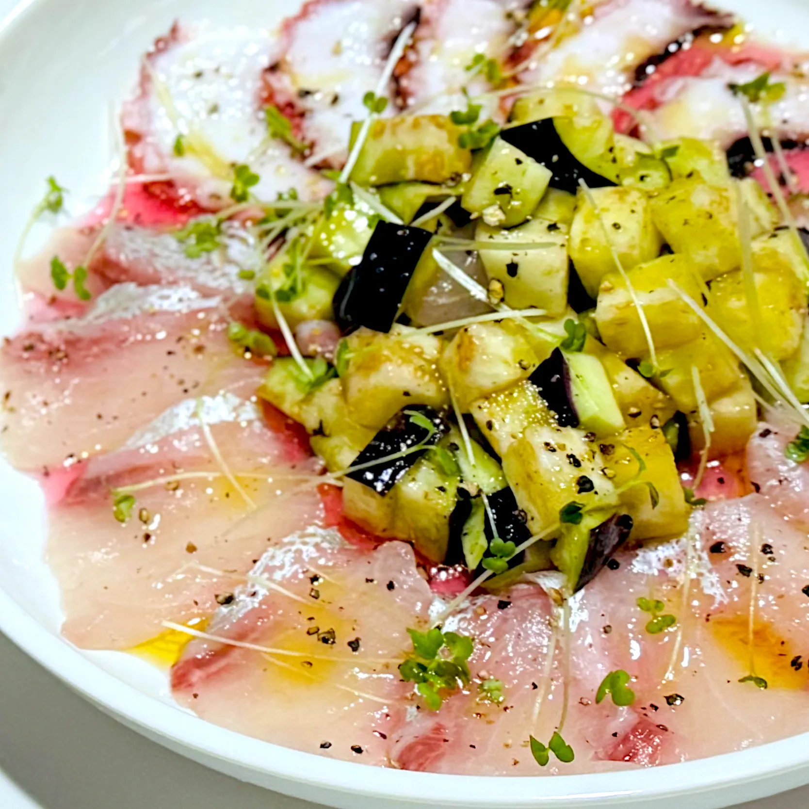 梅ボーイズの梅酢で爽やかなカルパッチョソースです #カンパチ #タコ #水なす #梅酢 #オリーブオイル #カルパッチョ