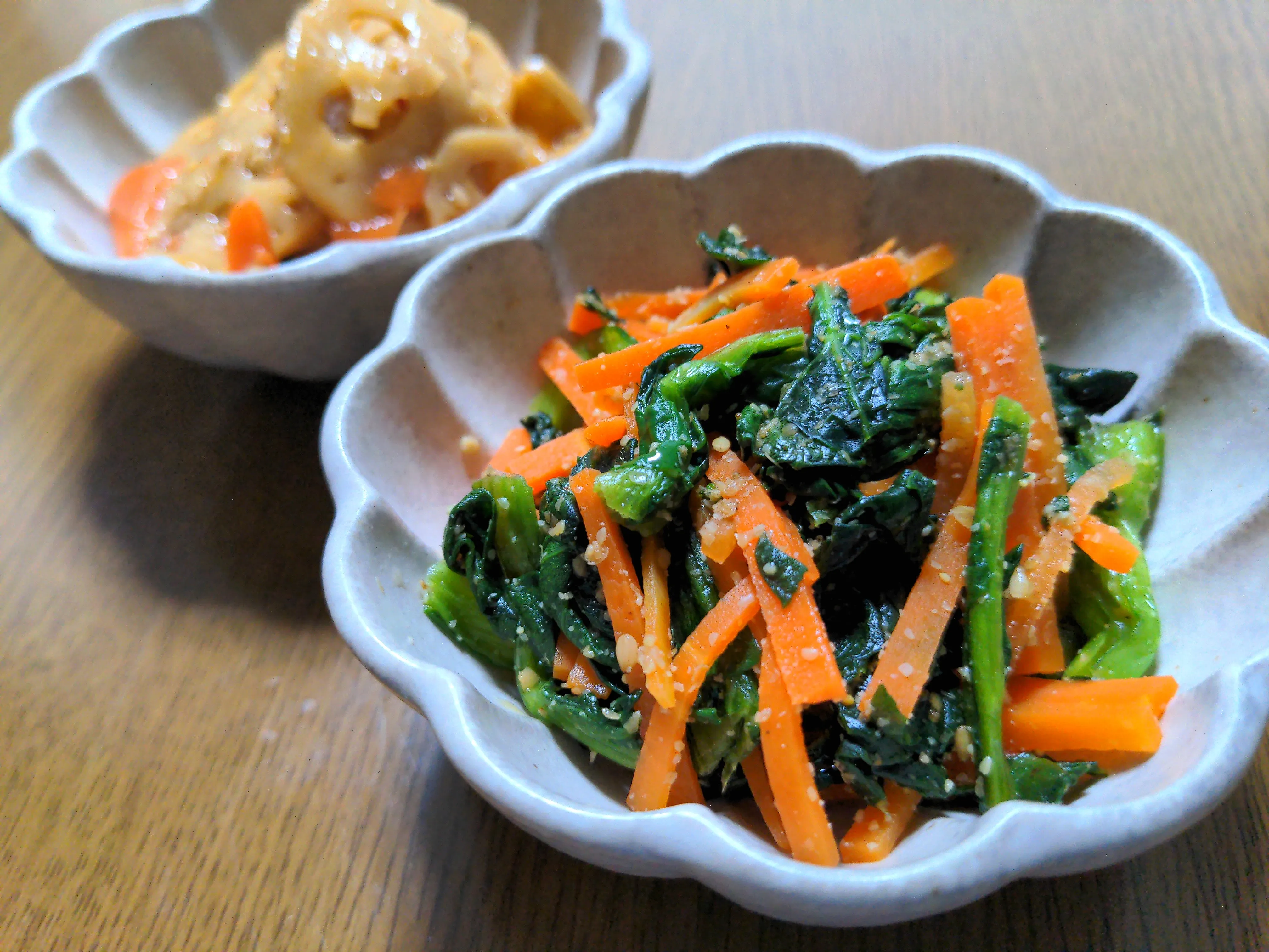 本日のおつまみは、小松菜と人参の胡麻和え&蓮根のキンピラです😊✨