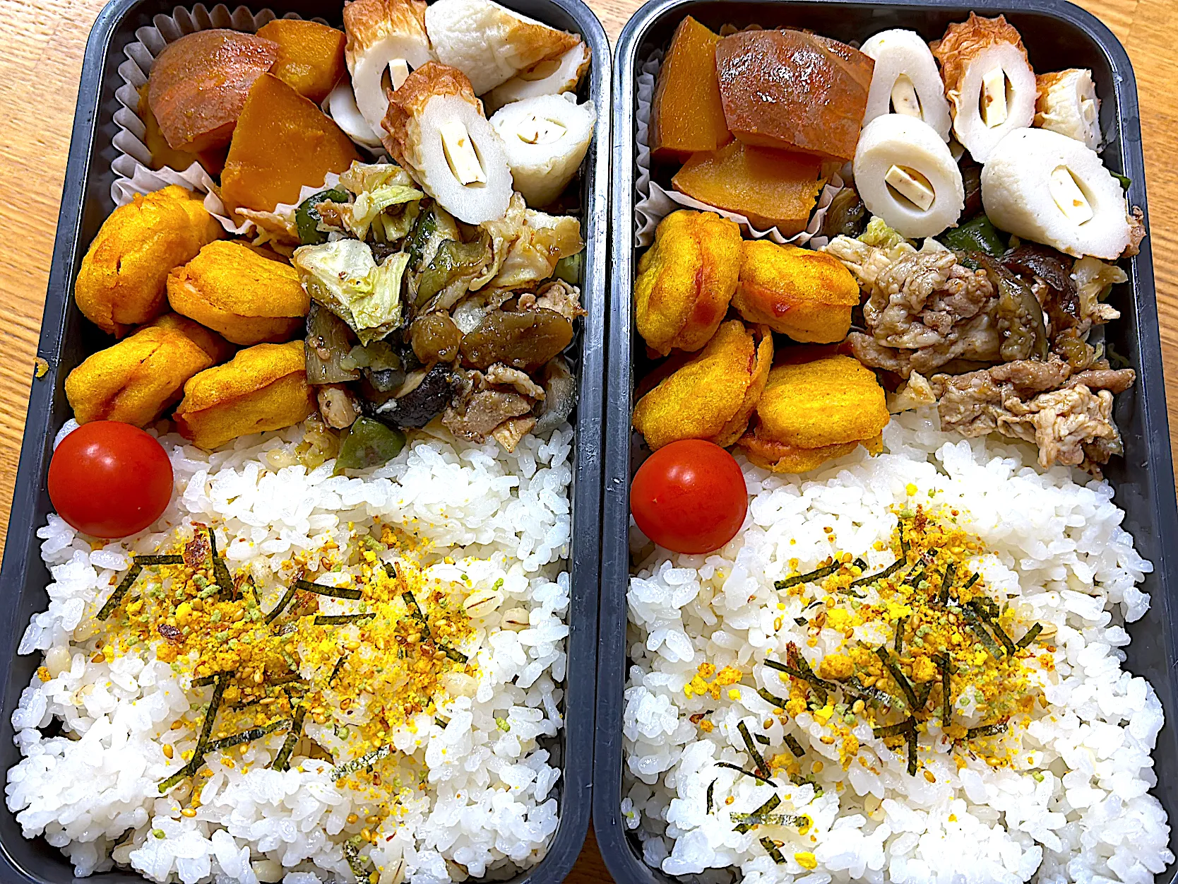 #男子弁当 #茄子と豚肉の炒め物 #ナゲット #チクチー #南京煮物