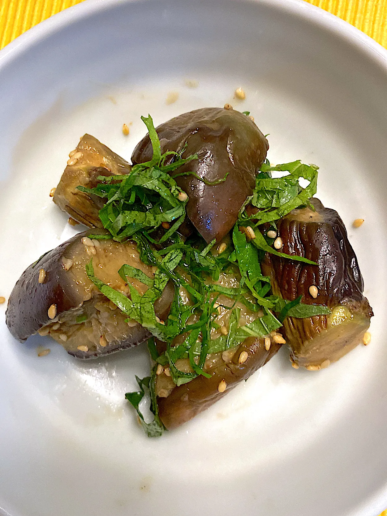 フライパンに茄子、赤唐辛子、生姜を入れてごま油で炒めて、つぶ味噌、砂糖で味付け。仕上げにゴマと刻み大葉をふりました。