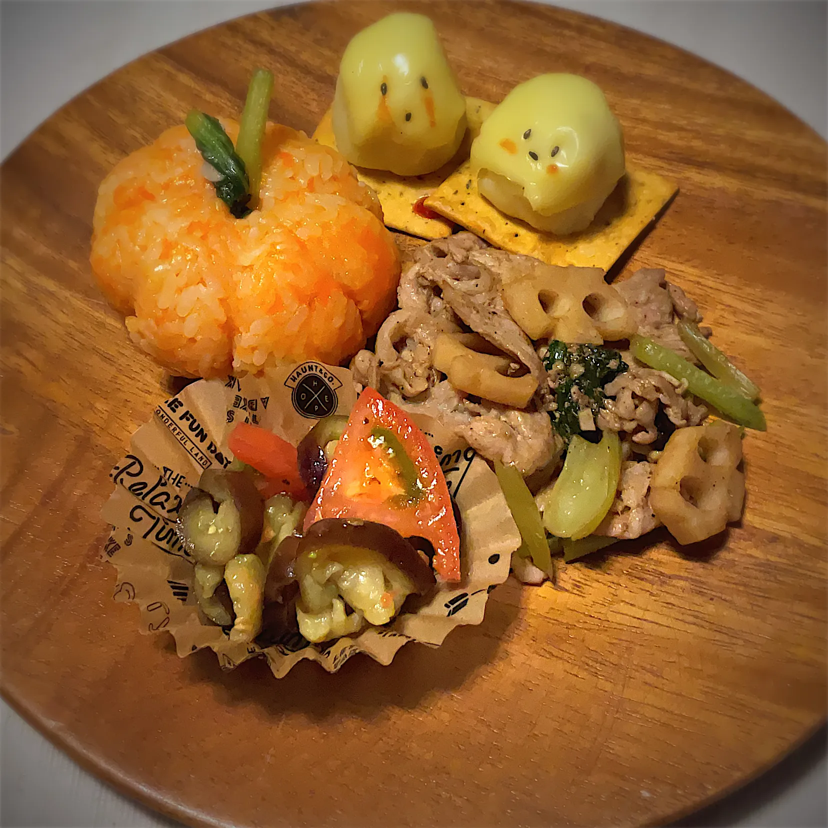 ご飯はカボチャの形🎃のにんじんご飯🥕