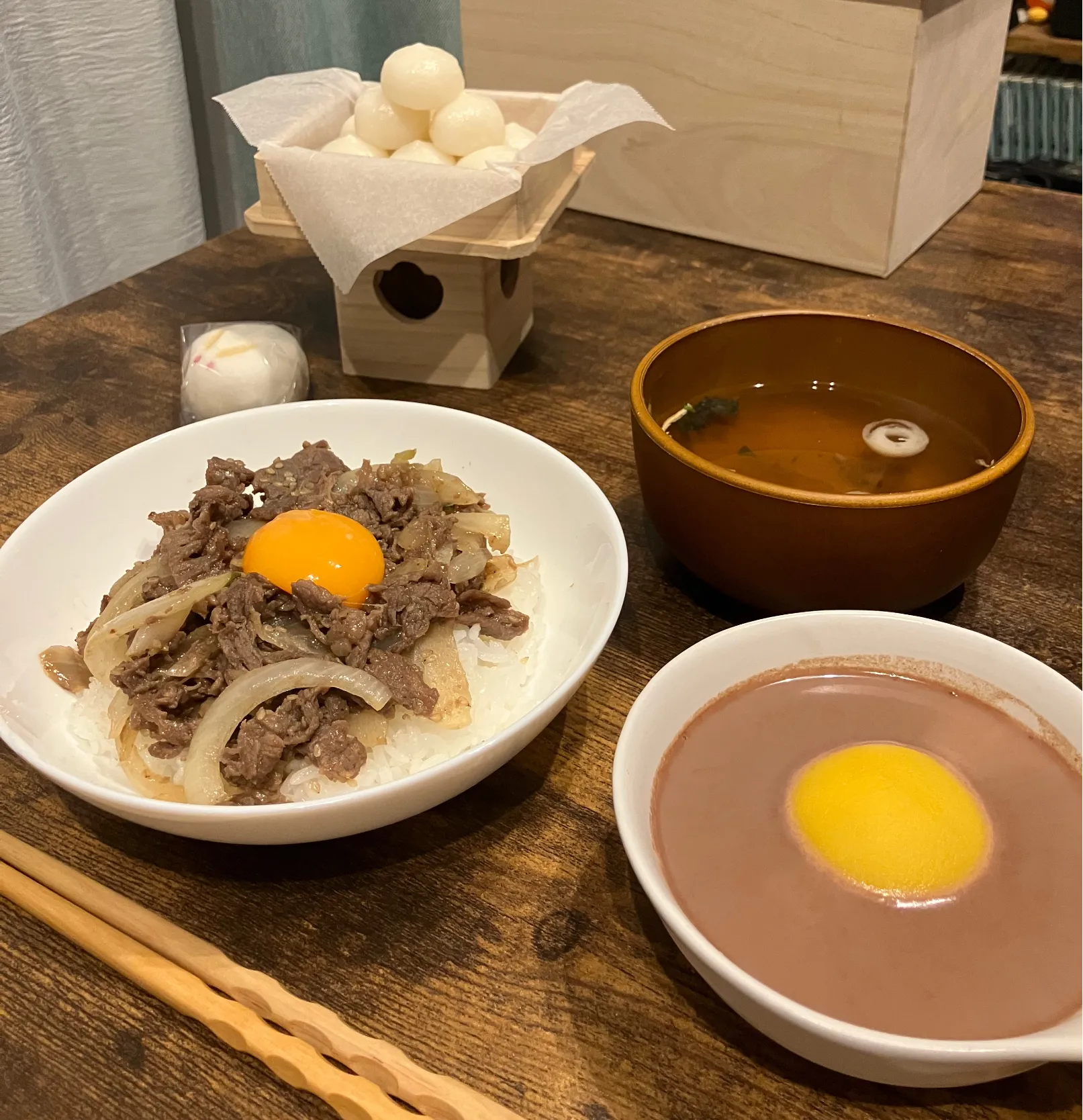 プルコギ月見丼、松茸の味お吸い物、黄桃ココア月見ゼリー、月見団子🎑 #お月見