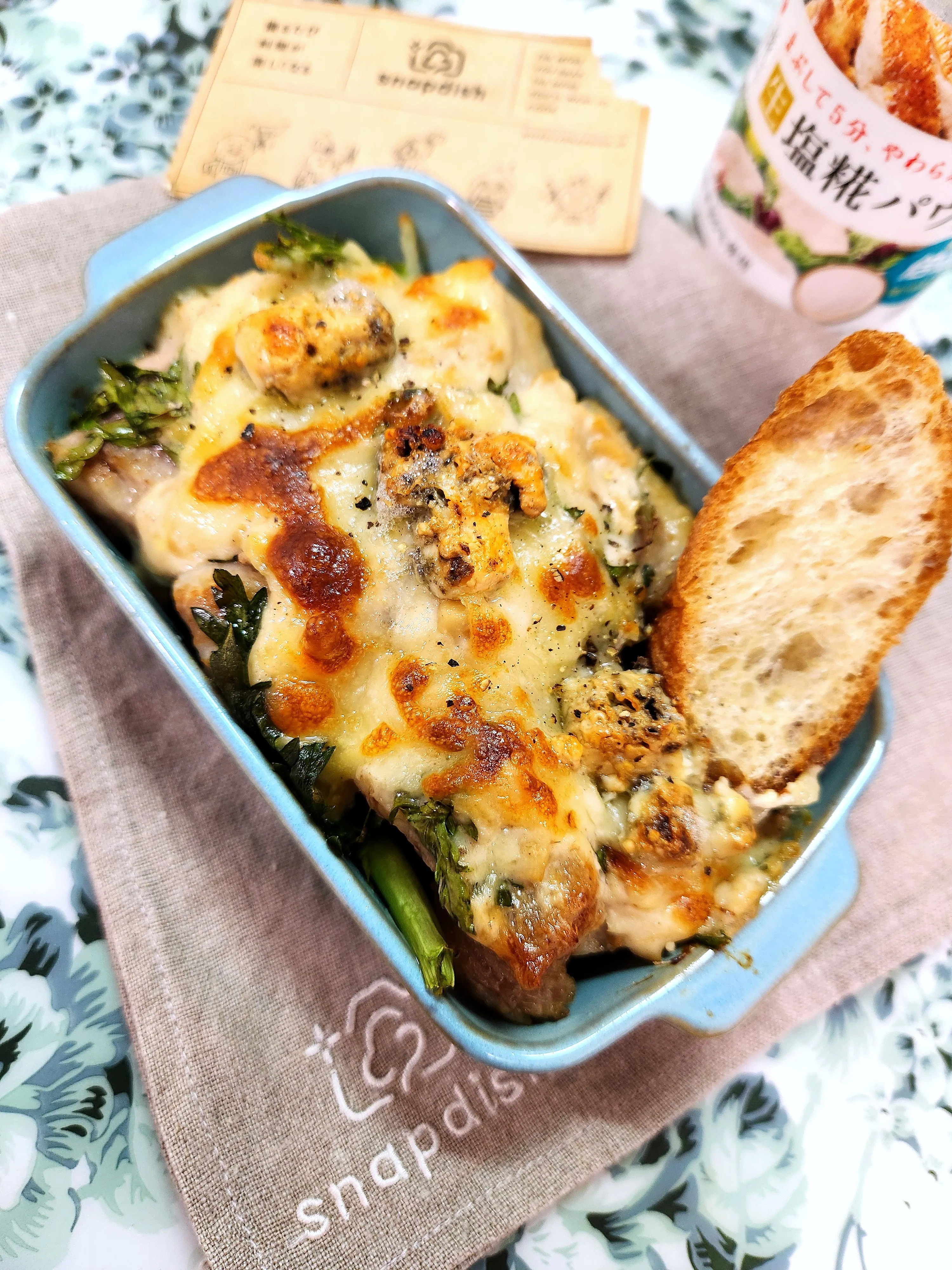 サラダ🥗で残った、生の春菊あるもんで適当に重ねたら美味しいグラタンに❗春菊の苦味ゴルゴンゾーラ🧀チーズの塩味🐖豚がよく合う🙆