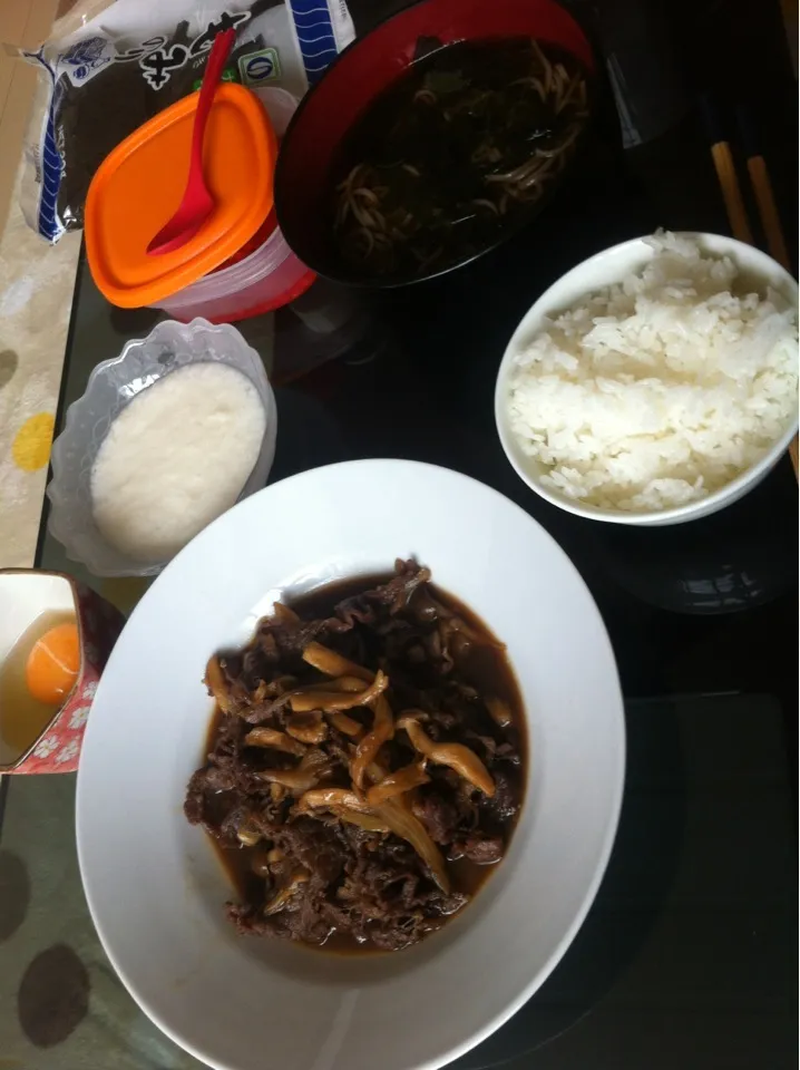 キノコたっぷりの牛丼ととろろ蕎麦♪色が悪い(笑)