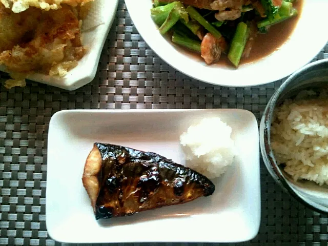 昼御飯、サバ塩焼き、なばな炒め、雪茸、舞茸天婦羅