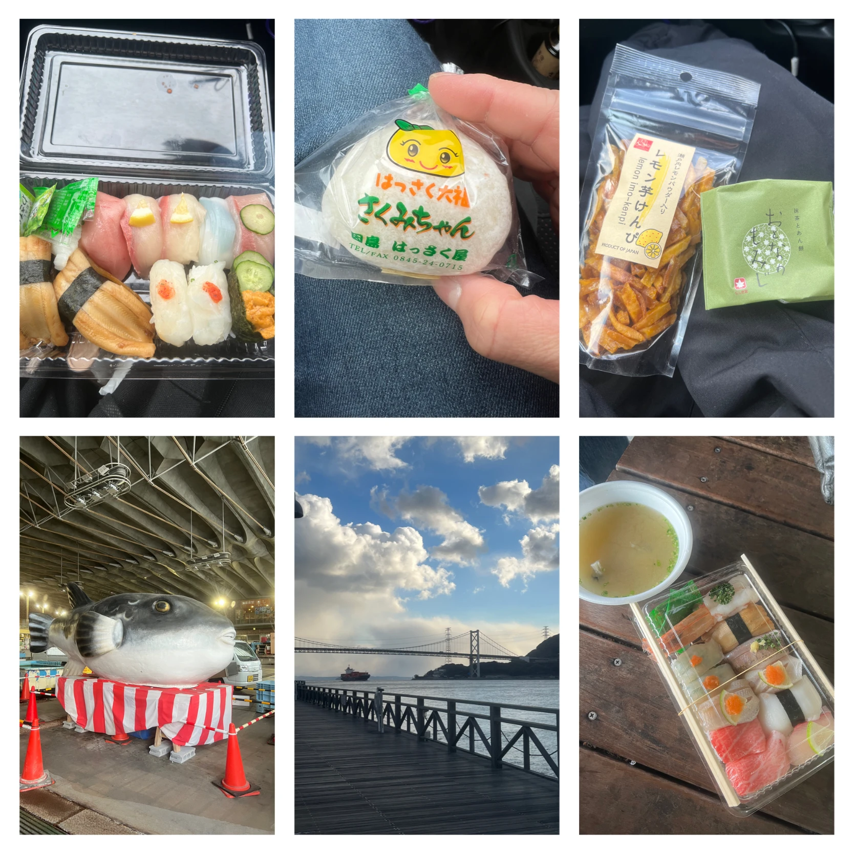 2日目朝ご飯に唐戸市場へ行き、お寿司を食べました(右下)。フグ汁もプラス。風も強く、吹きっさらしの場所で食べるから、汁は冷めるは、寿司は冷蔵庫に入ってましたか?くらいに冷たーい💦