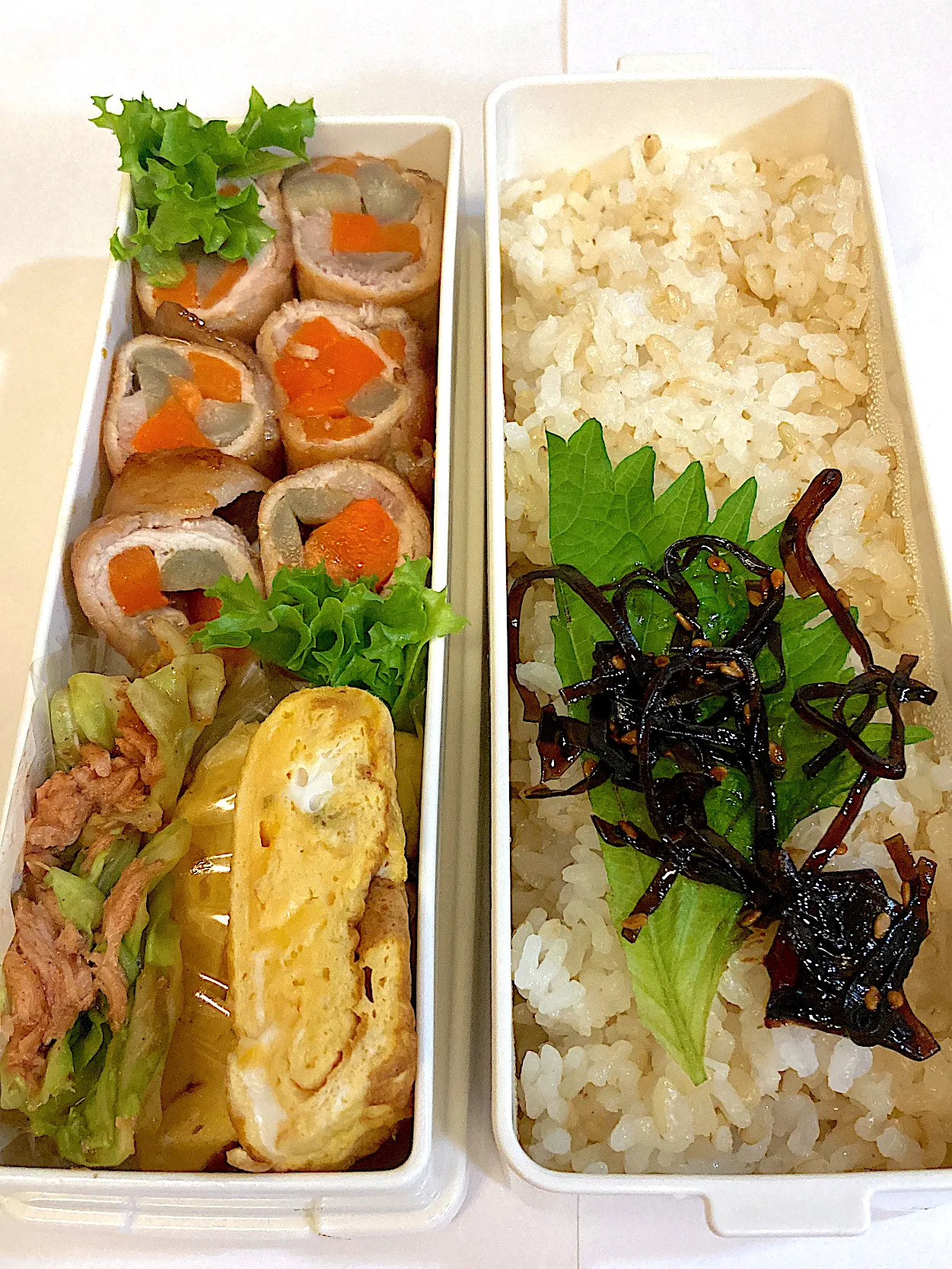 キャベツとツナ炒め、卵焼きを添えて、根菜の旨みがしっかり楽しめるお弁当です。