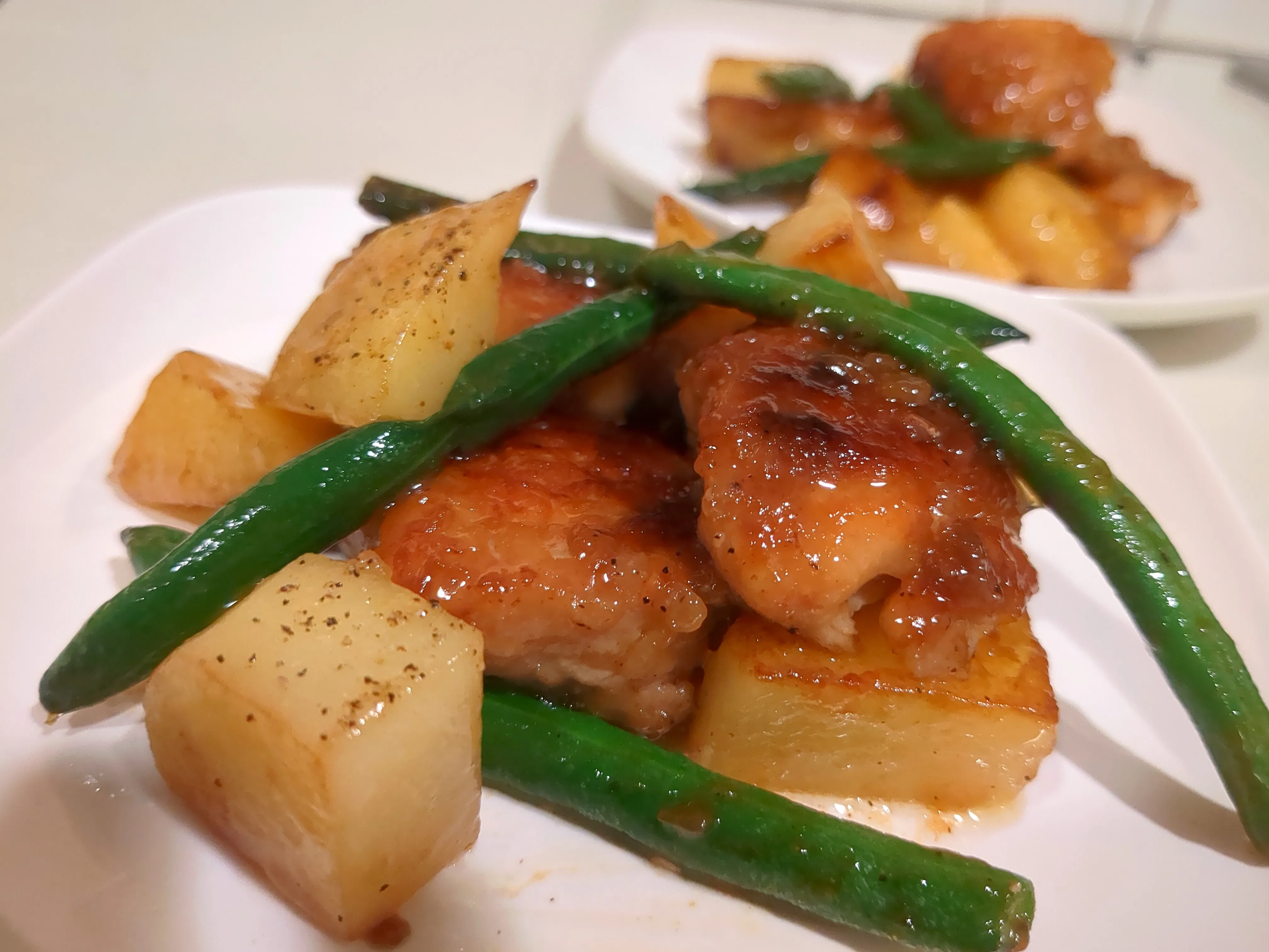 今日は、仕事から帰って解凍しておいた、鶏もも肉に片栗粉をまぶして焼いて、チンしたじゃがいもと冷凍いんげんで、照り焼き味にしました