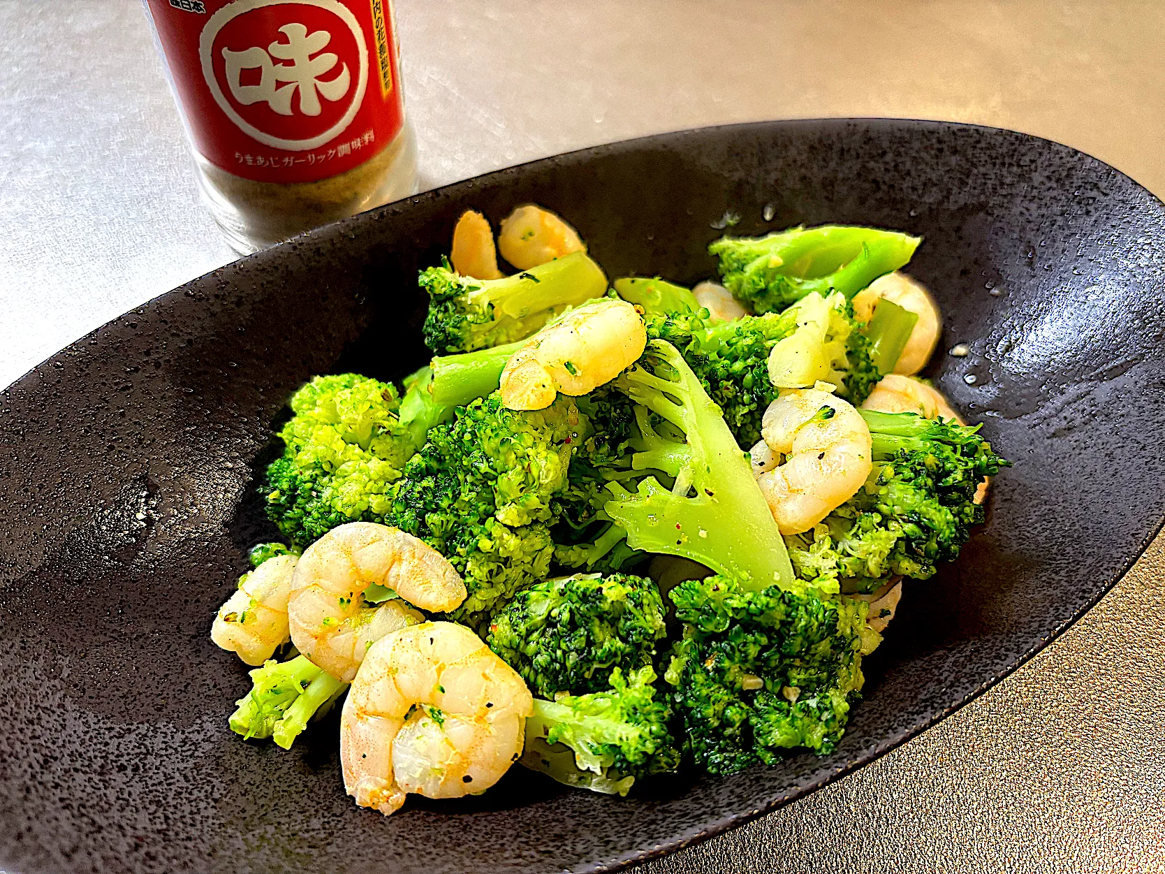海老とブロッコリーのあじまる(うまあじガーリック調味料)炒め