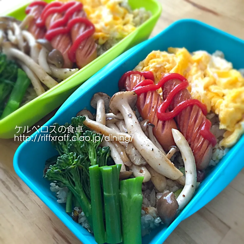 ツナとズッキーニのチャーハン、ブロッコリー、シメジのソテー、ウィンナー、スクランブルエッグ