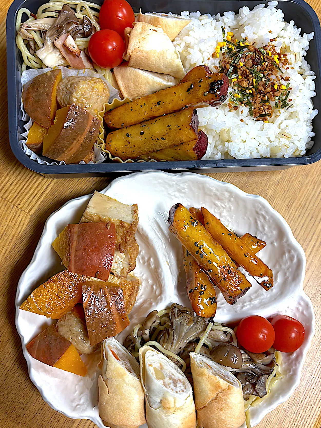 #男子弁当 #冷凍春巻き #きのこパスタ #南京と厚揚げと肉団子の煮物 #芋棒