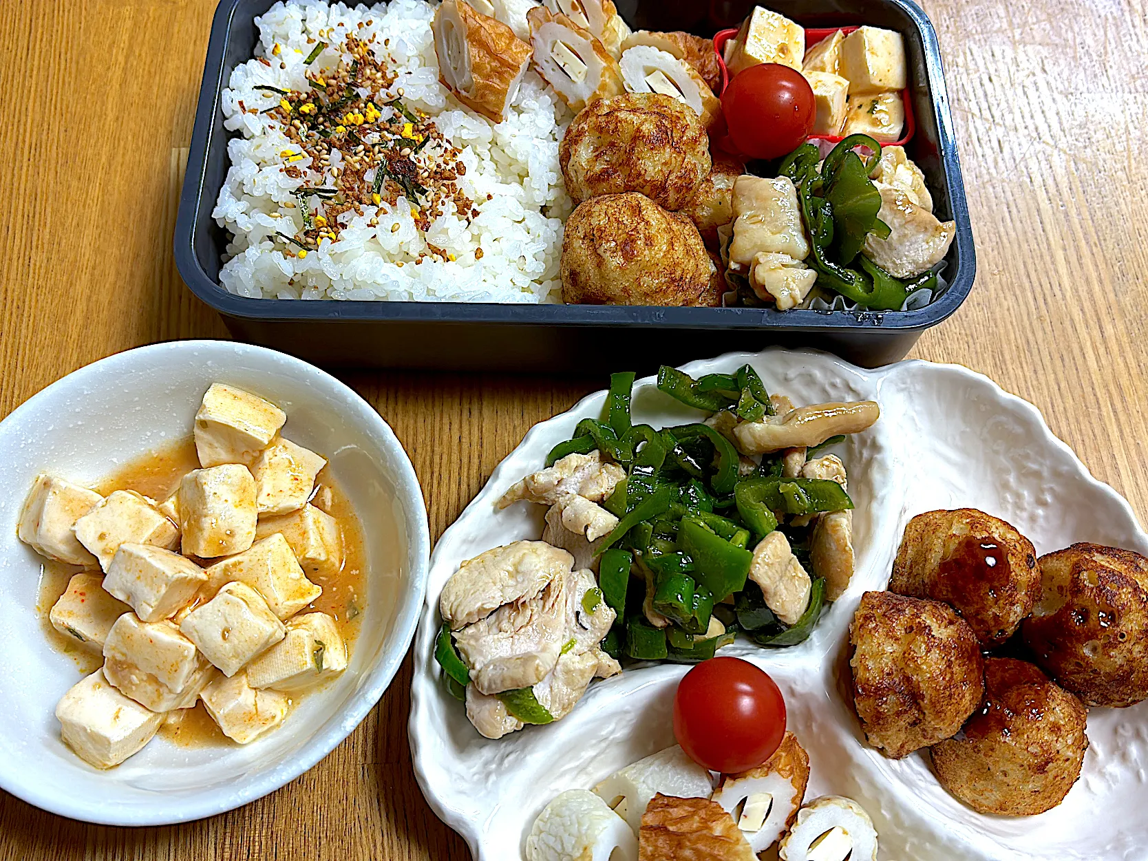 #男子弁当 #たこ焼き #チクチー #ピーマンと鶏肉のオイスターソース炒め #麻婆豆腐