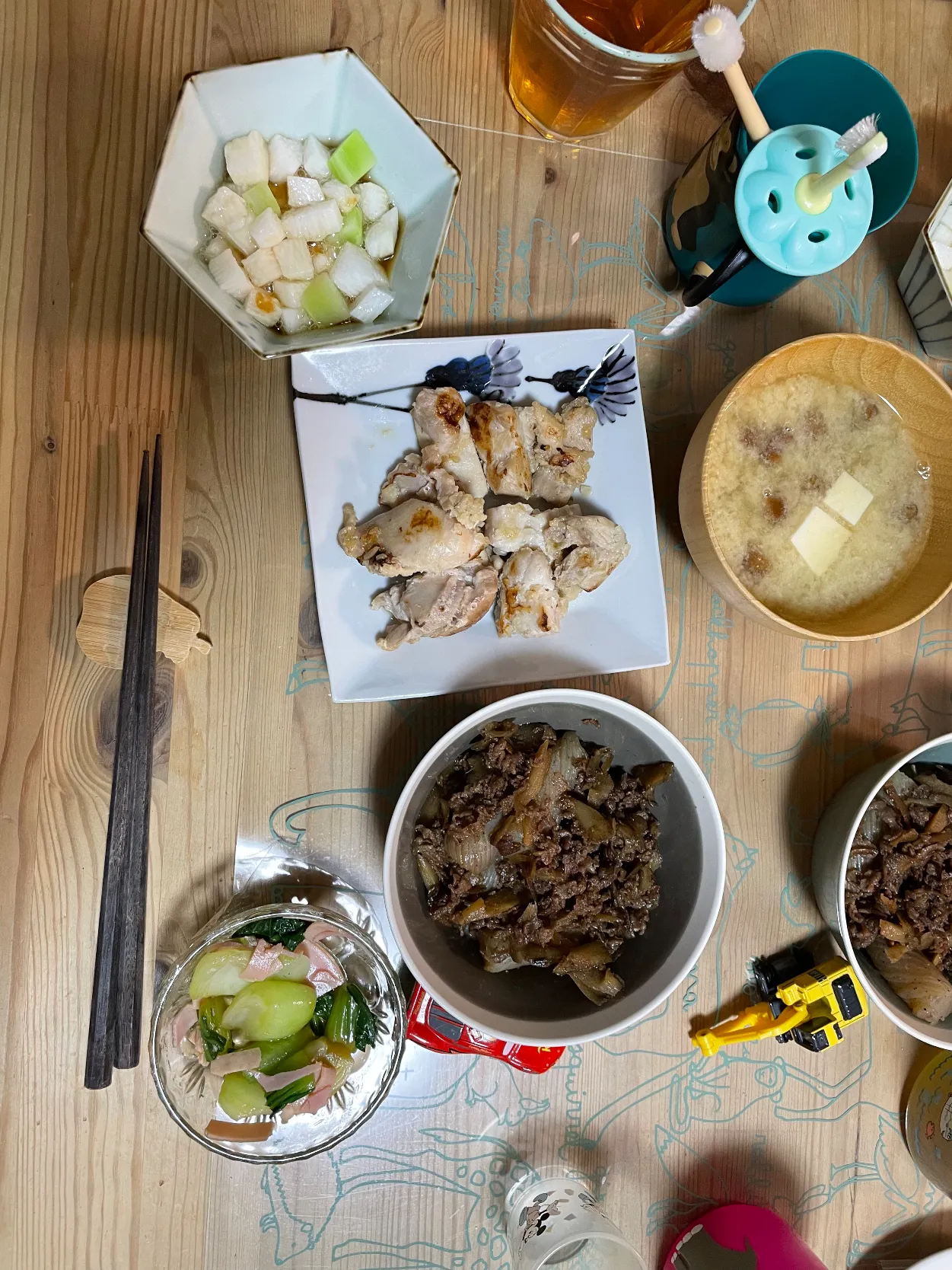 #鶏もも塩麹炒め #牛肉とごぼうの時雨煮 #なめこと豆腐の味噌汁 #チンゲンサイとハムの中華サラダ