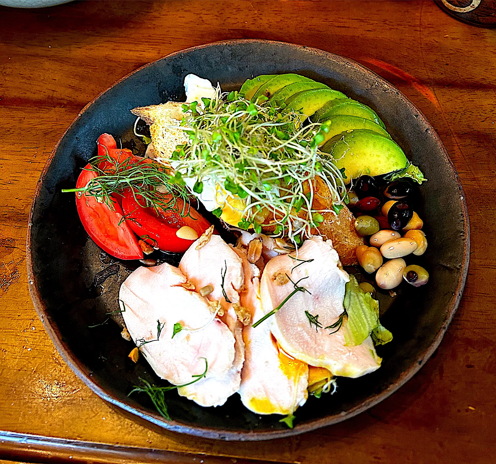 #ディル #野菜豆 #サラダ #鶏ハム #バケット #ポーチドエッグ #ブロッコリースプラウト #アボカド