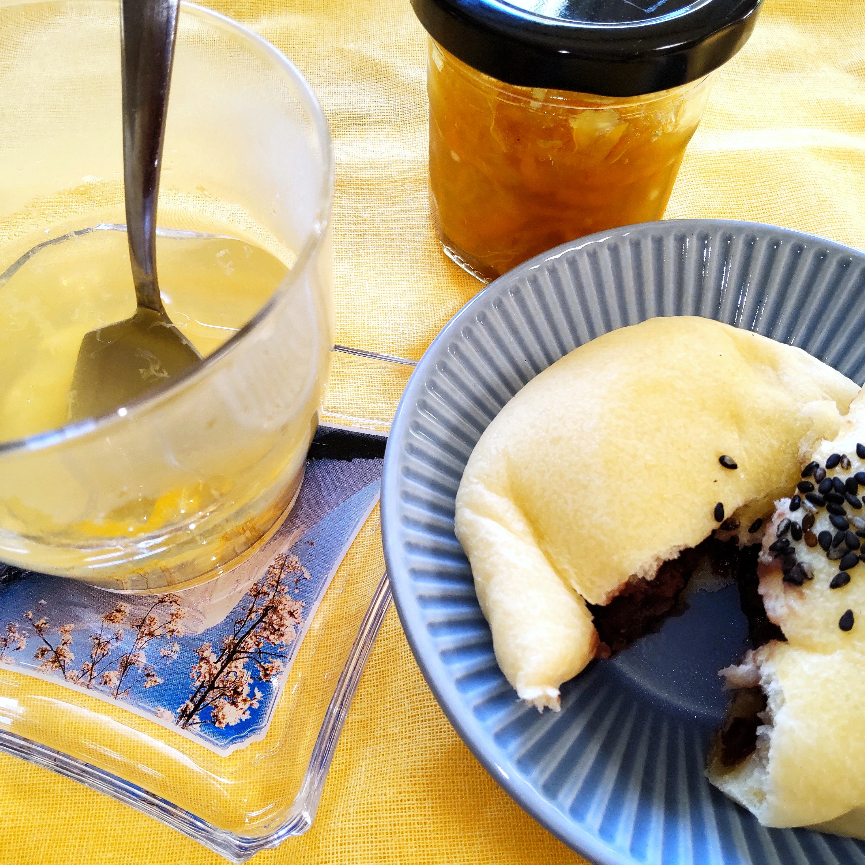 3日前に作ったママレード、シットリと落ち着いて味も優しい甘さになってます。アンパンにぴったりの飲み物に。熱いお湯で、好きなだけ入れて溶かして飲んでます