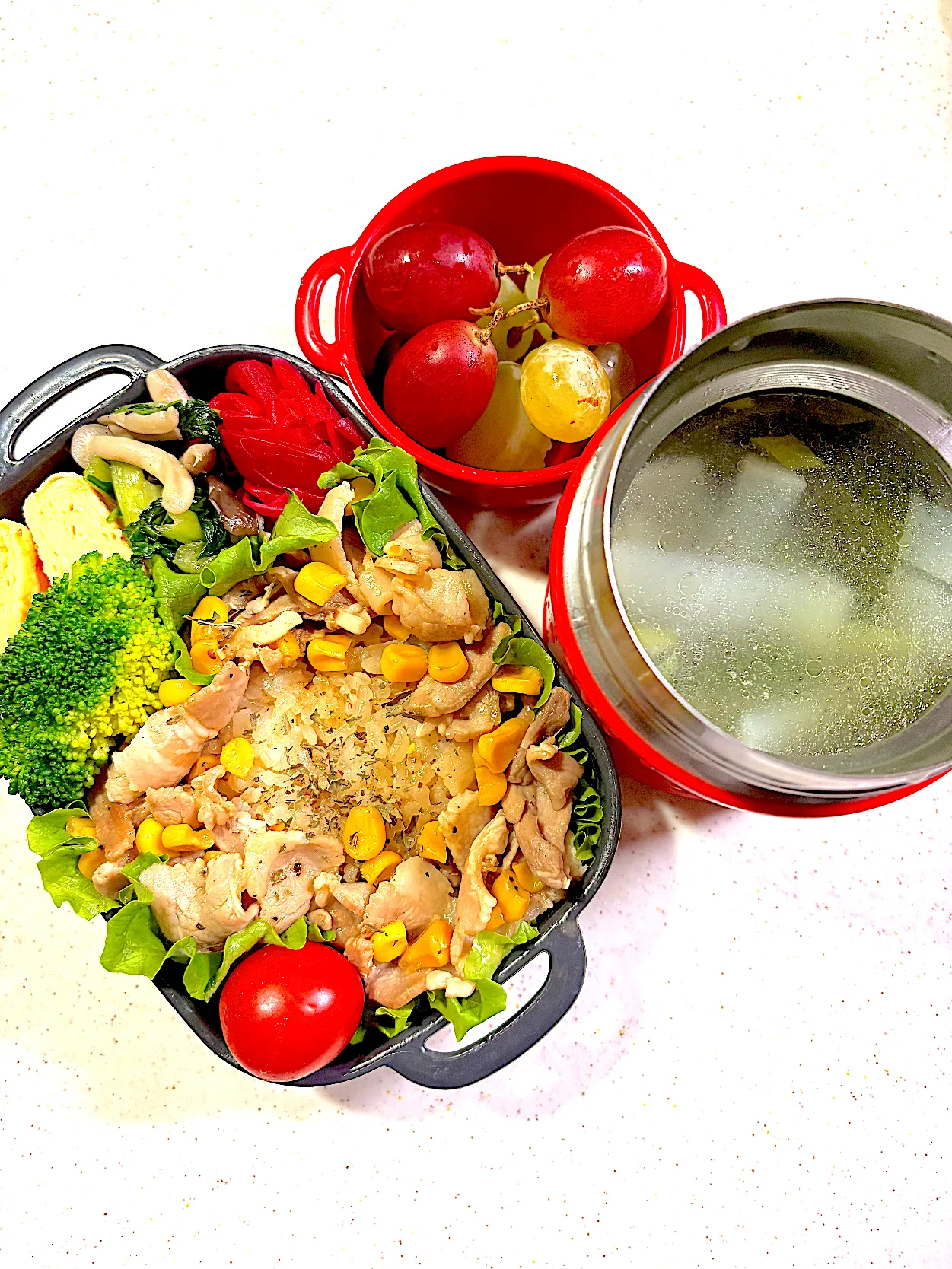 ペッパーランチ風のピラフ(?)は牛肉が無かったので豚バラで代用。