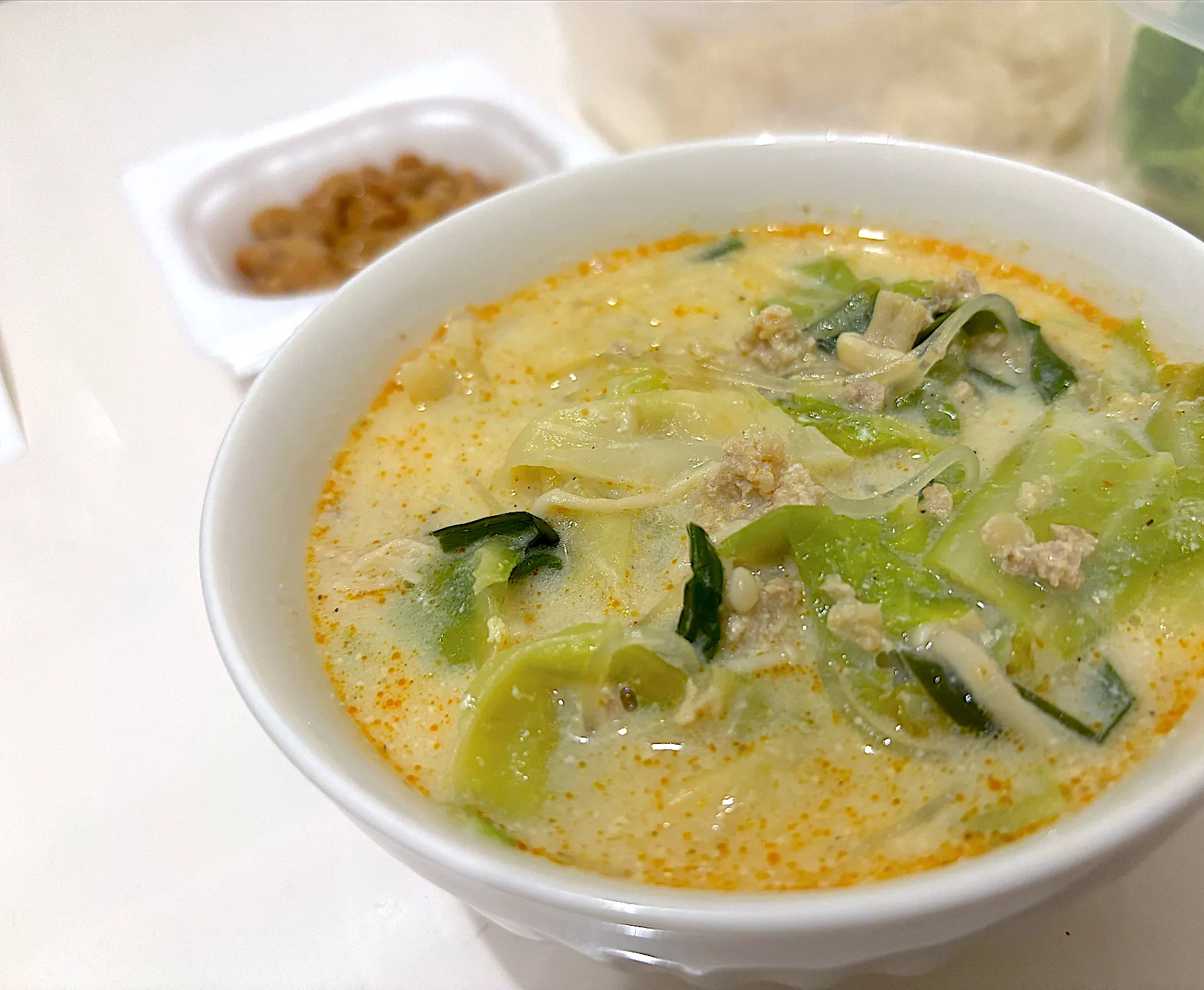 #白菜 #キャベツ #青梗菜 #ニラ #えのき #鶏ひき肉 #春雨