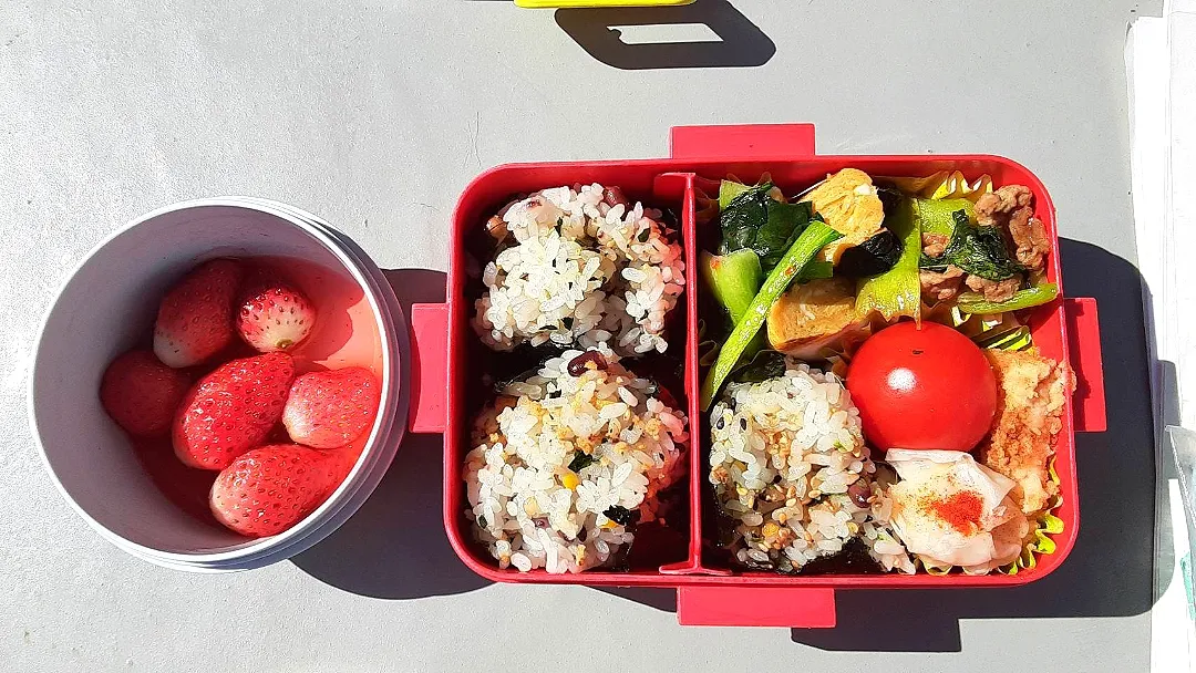 卵焼き、鶏カツ、小松菜と豚肉の炒め物、焼売、青梗菜の中華和え