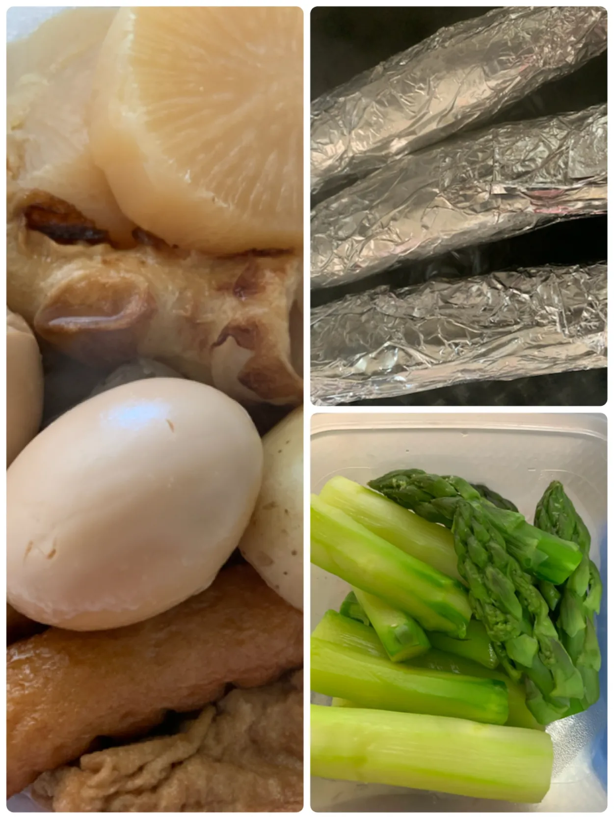 おでん🍢。塩茹でアスパラガス。焼き芋🍠。