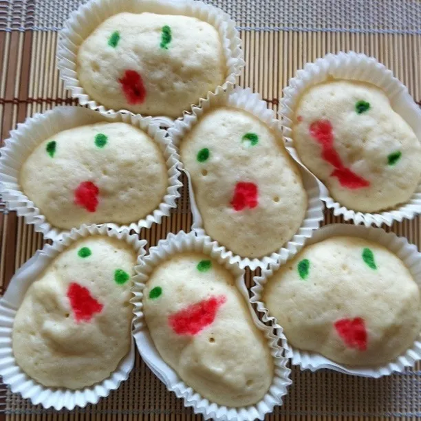 蒸しパンの素を、分量通りに作ります。食紅と緑少しをお水に溶き、カップに、流した生地に、爪楊枝で、目と口を書いて、レンチンしたら、出来上がり!!パンダとかもかわいいかも!(o'∀')ノ