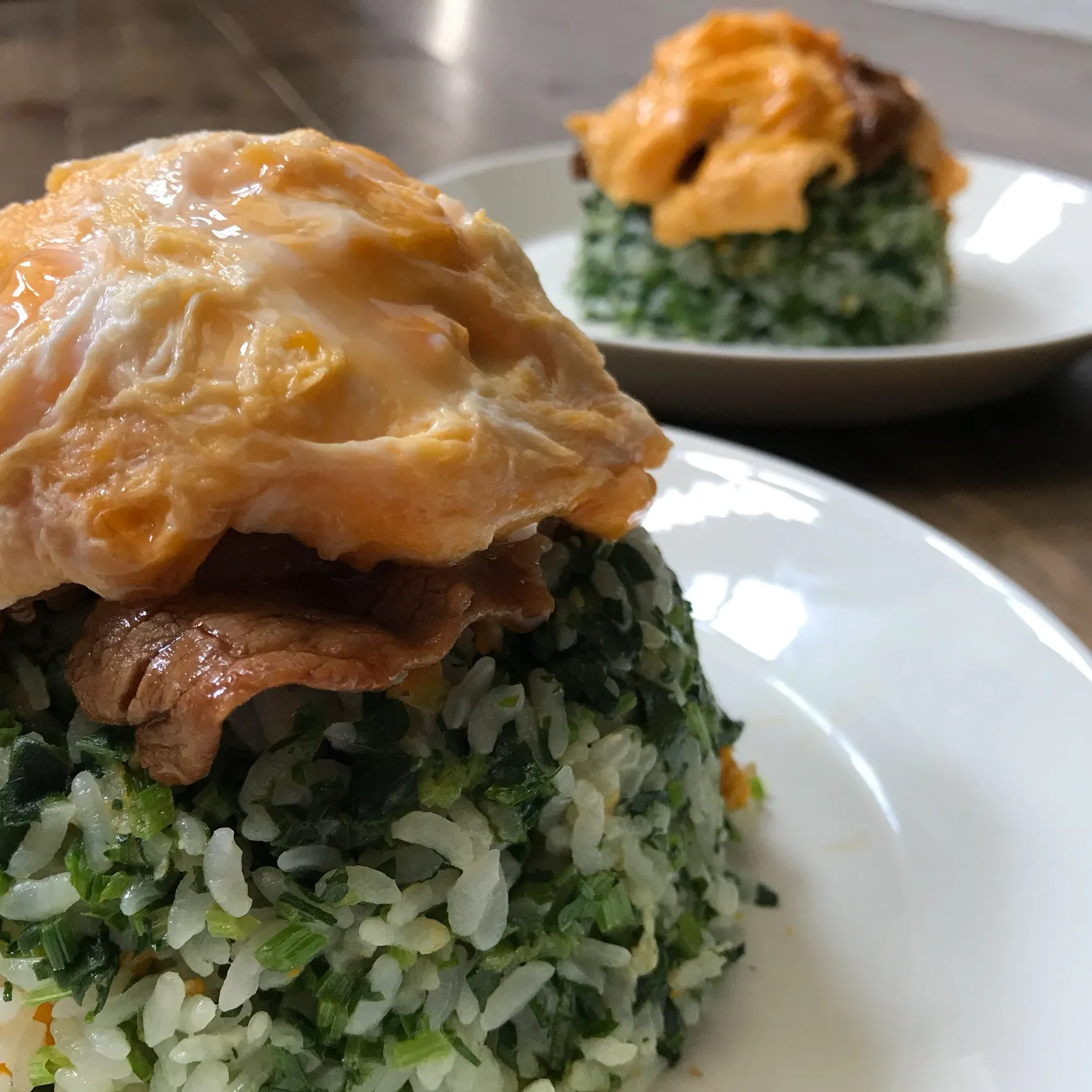 炒飯はかなりの薄味ですでほうれん草の主張がたっぷりですが、濃いめに味付けし炒めた豚と食べることでとっても美味しく(´・Д・)」