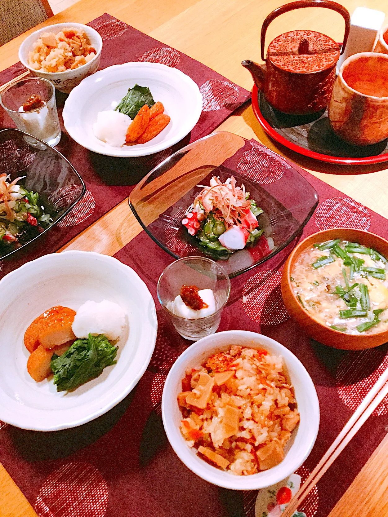 筍のおこわ、蛸と胡瓜の酢の物、 薩摩揚げとほうれん草煮浸し