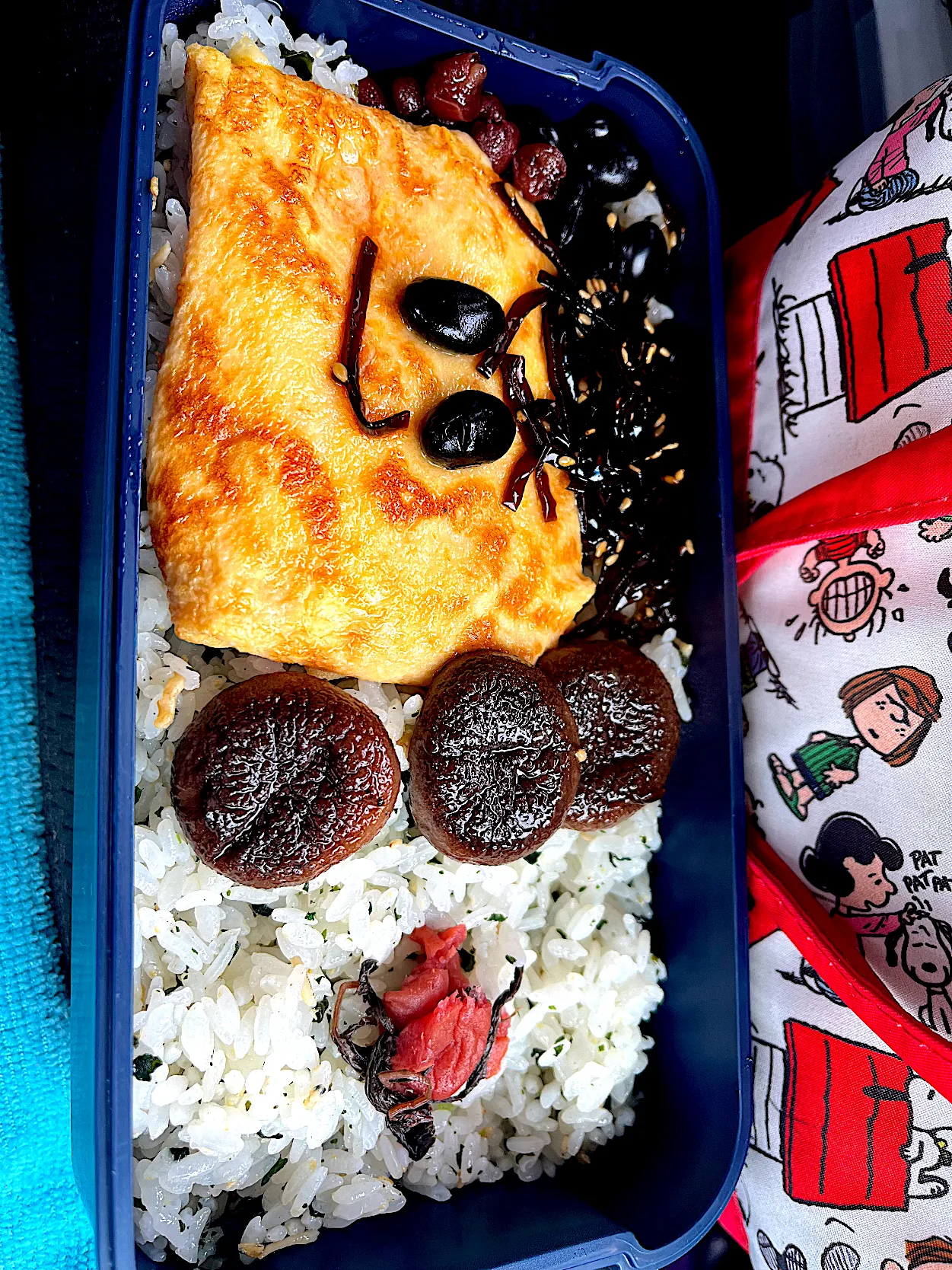 #昼飯 豆と子持ち昆布の天パー顔チーズオムレツと梅と焼き椎茸3個と黒豆7個あずき豆7個乗せワカメしらす混ぜご飯弁当