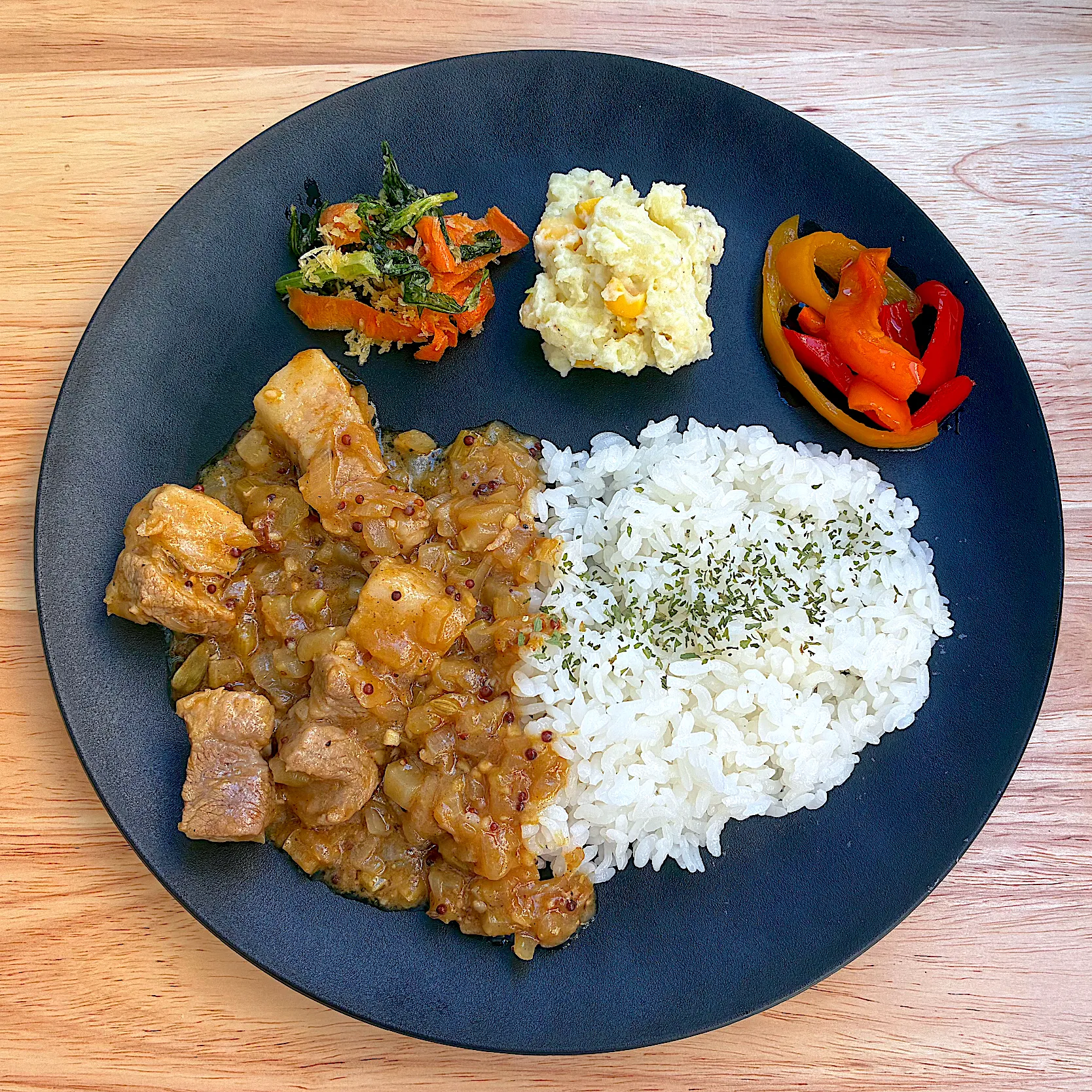 つけ合わせはセロリの葉のココナッツ炒めとパプリカマリネ、マッシュポテトには余ってたココナッツミルクを練り込みました♪