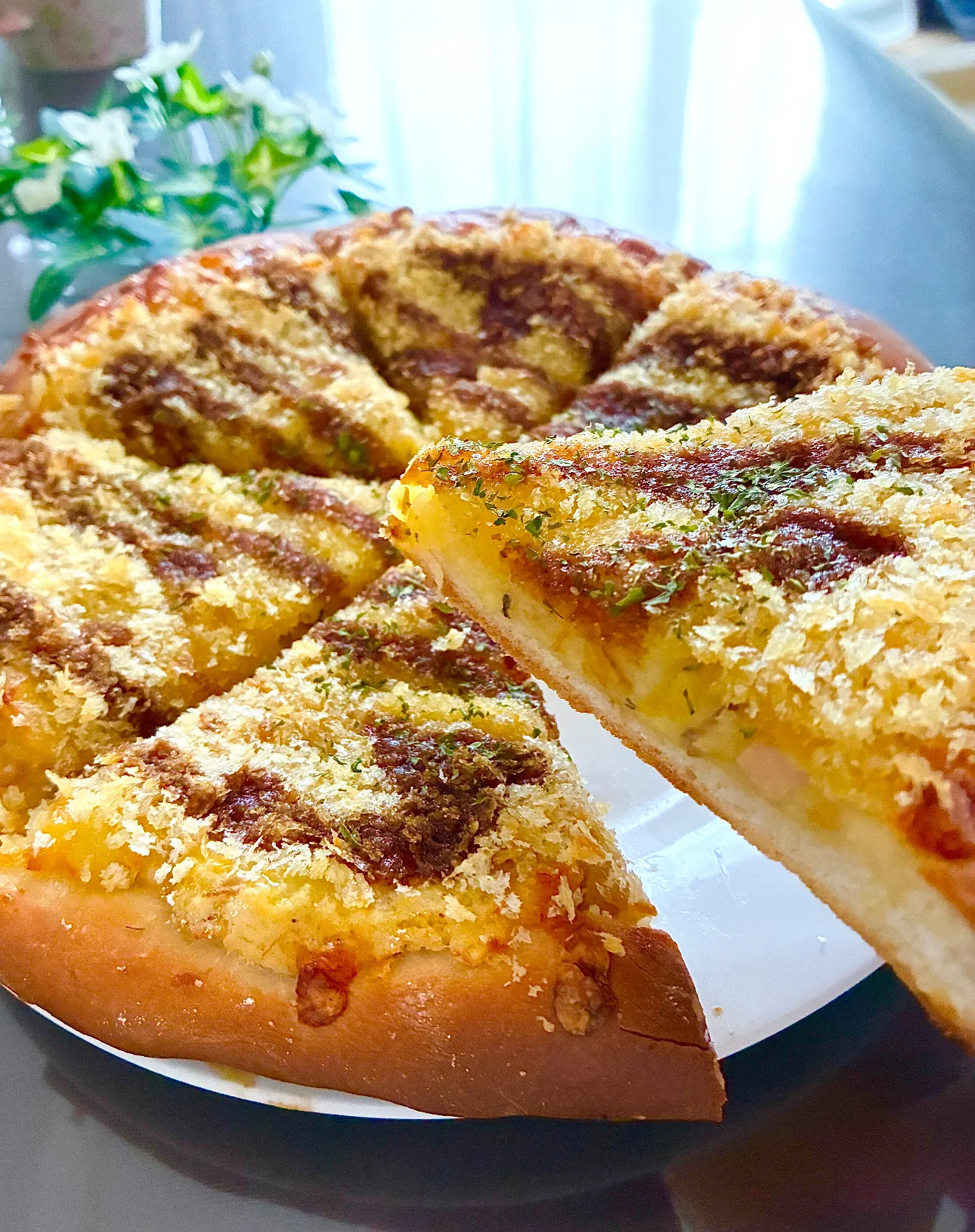 ピザ生地にコロッケの種を乗せて衣をつけて焼き上げた、コロッケピザ🍕