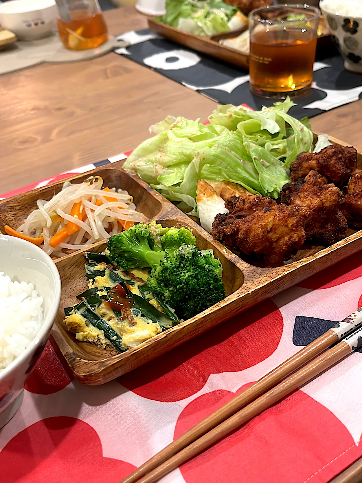 塩麹唐揚げ/ちくきゅう/もやしナムル/ニラ卵