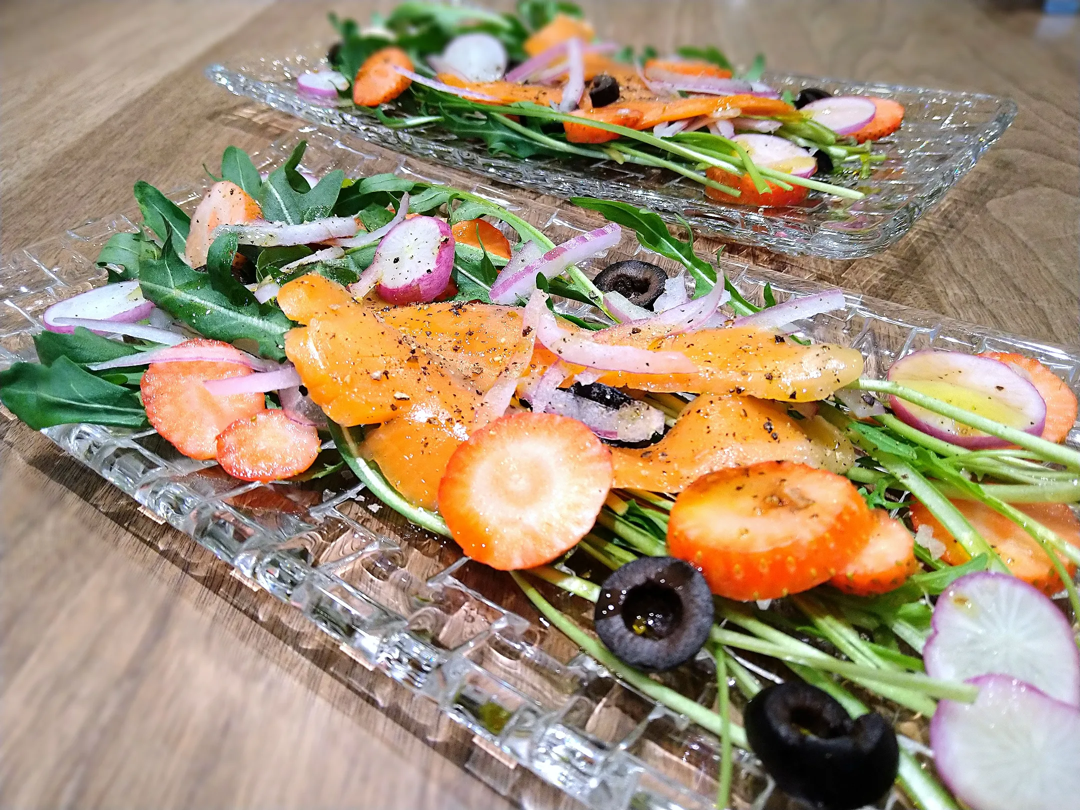#簡単料理 #サラダ #野菜料理 #セルバチコ#ルッコラ#フルーツ #いちご#魚料理 #スモークサーモン#バルサミコ#お花見