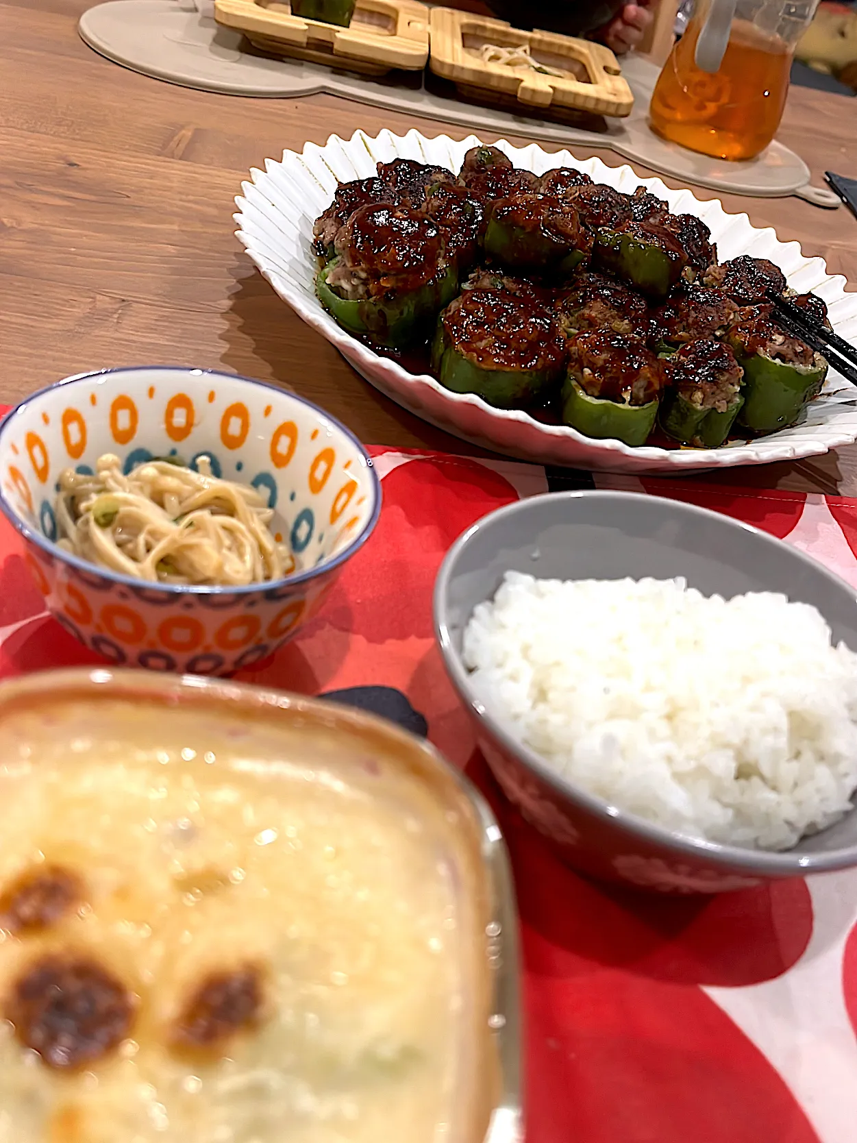#簡単料理 #3人家族 #晩御飯 #ピーマン #ミニ #グラタン #えのきのマリネ #保存食/常備菜