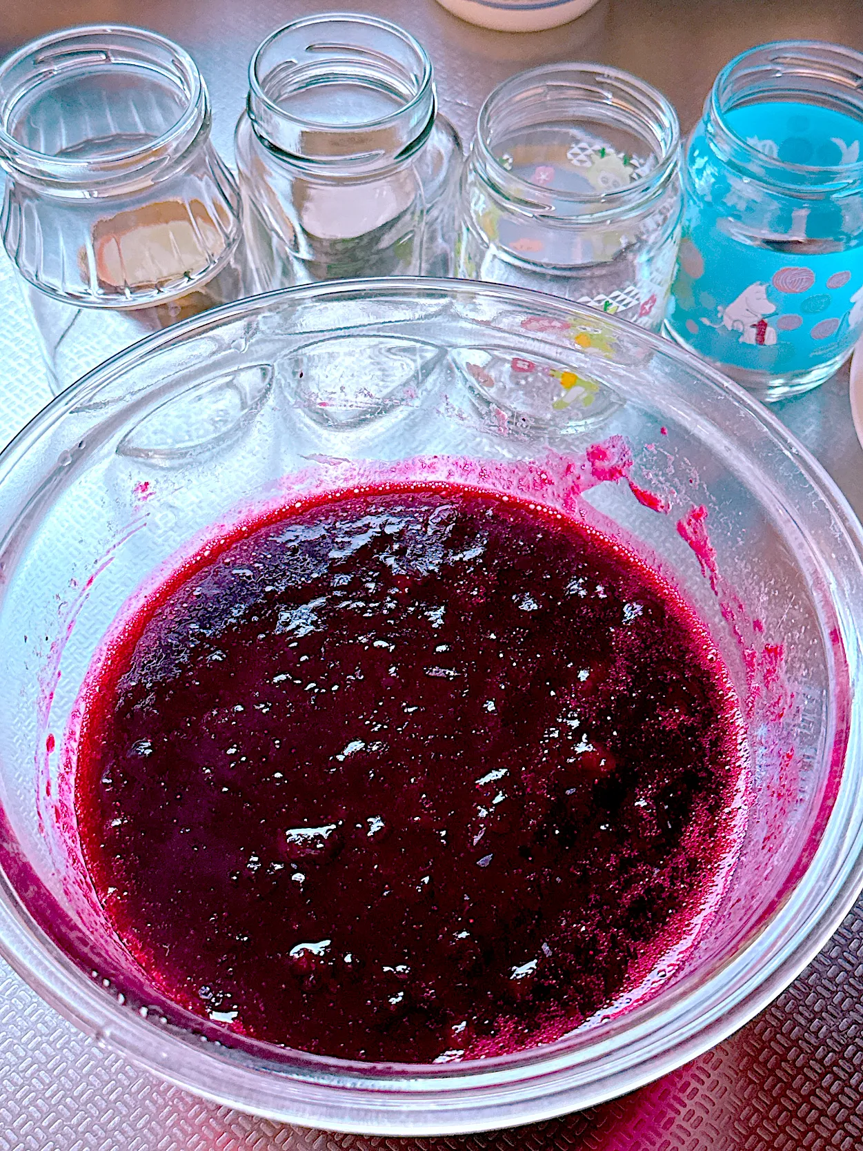 煮沸消毒したガラス瓶に熱々のジャムを詰めます。
