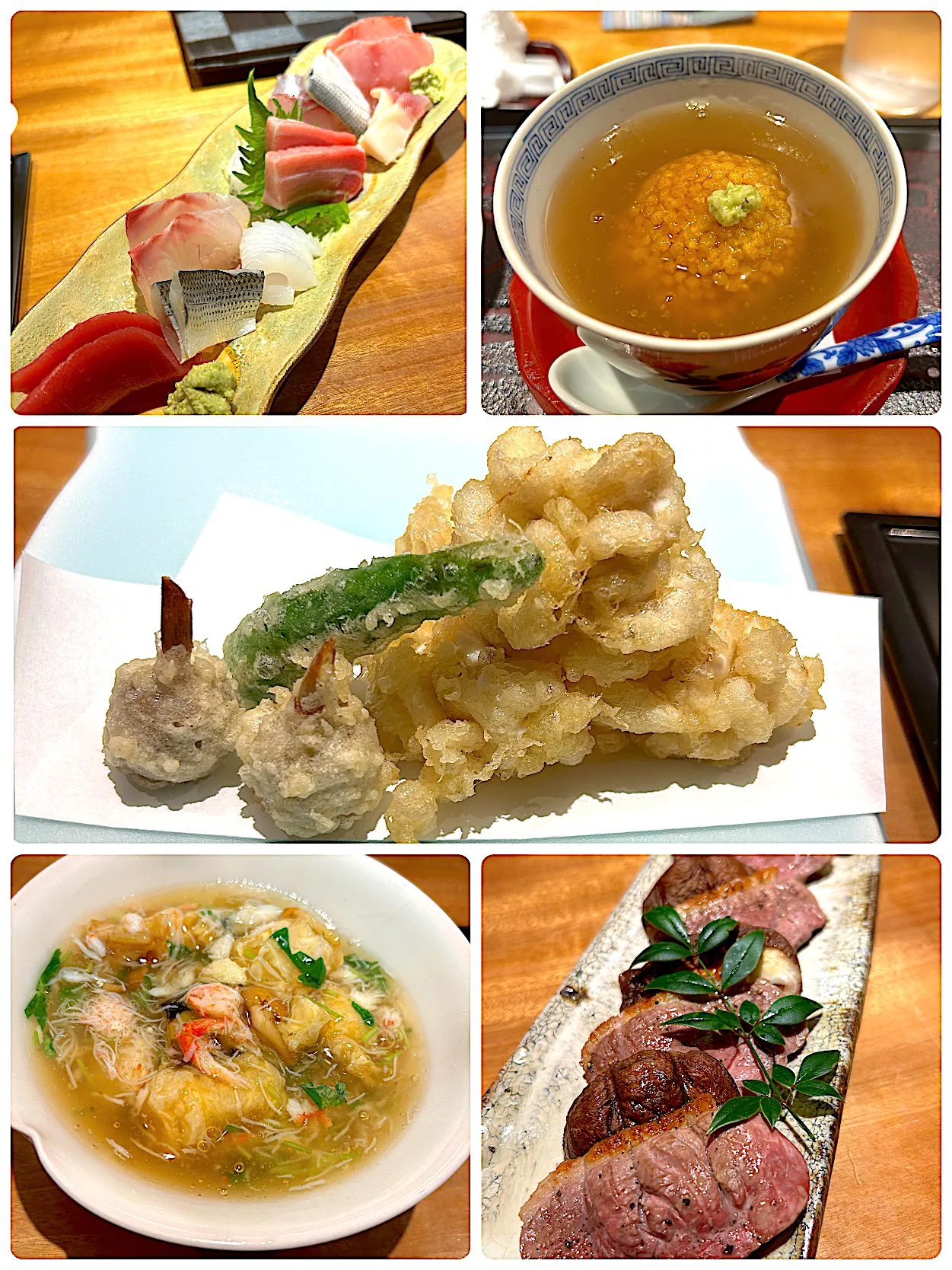 お造り盛り合わせ(鮪赤身・中トロ、金目鯛、いか、こはだ、真鯛、北寄貝、ほうぼう)、真鱈白子の天ぷら、揚げ湯葉と茄子のあんかけ、蓮根まんじゅう、合鴨と椎茸焼き @旬の味 みなと