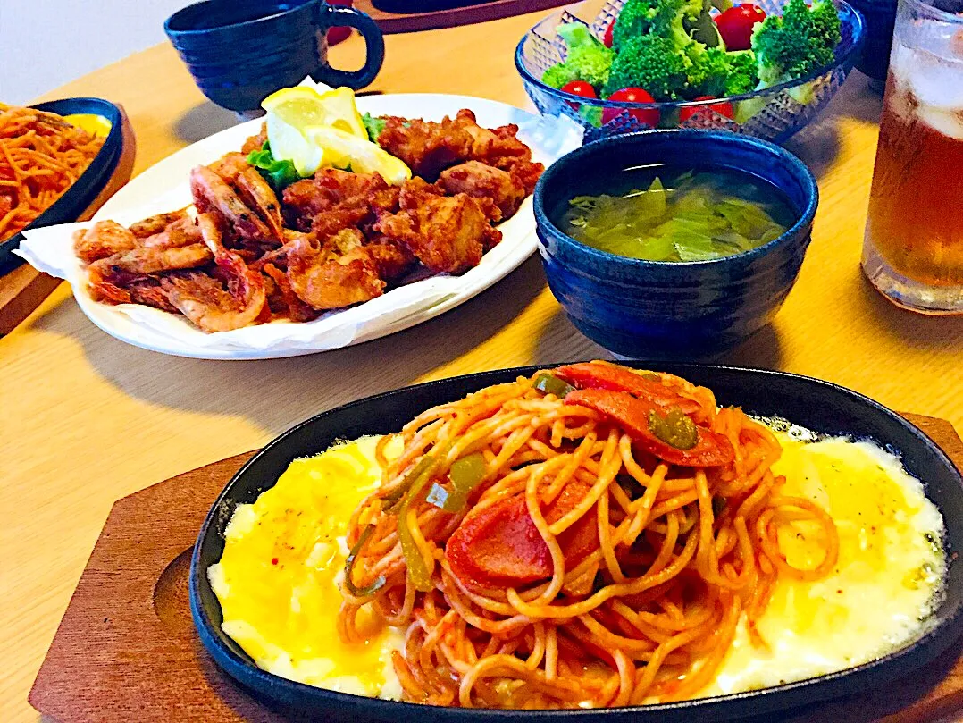 #鉄板ナポリタン #卵チーズ #サラダ #レタススープ