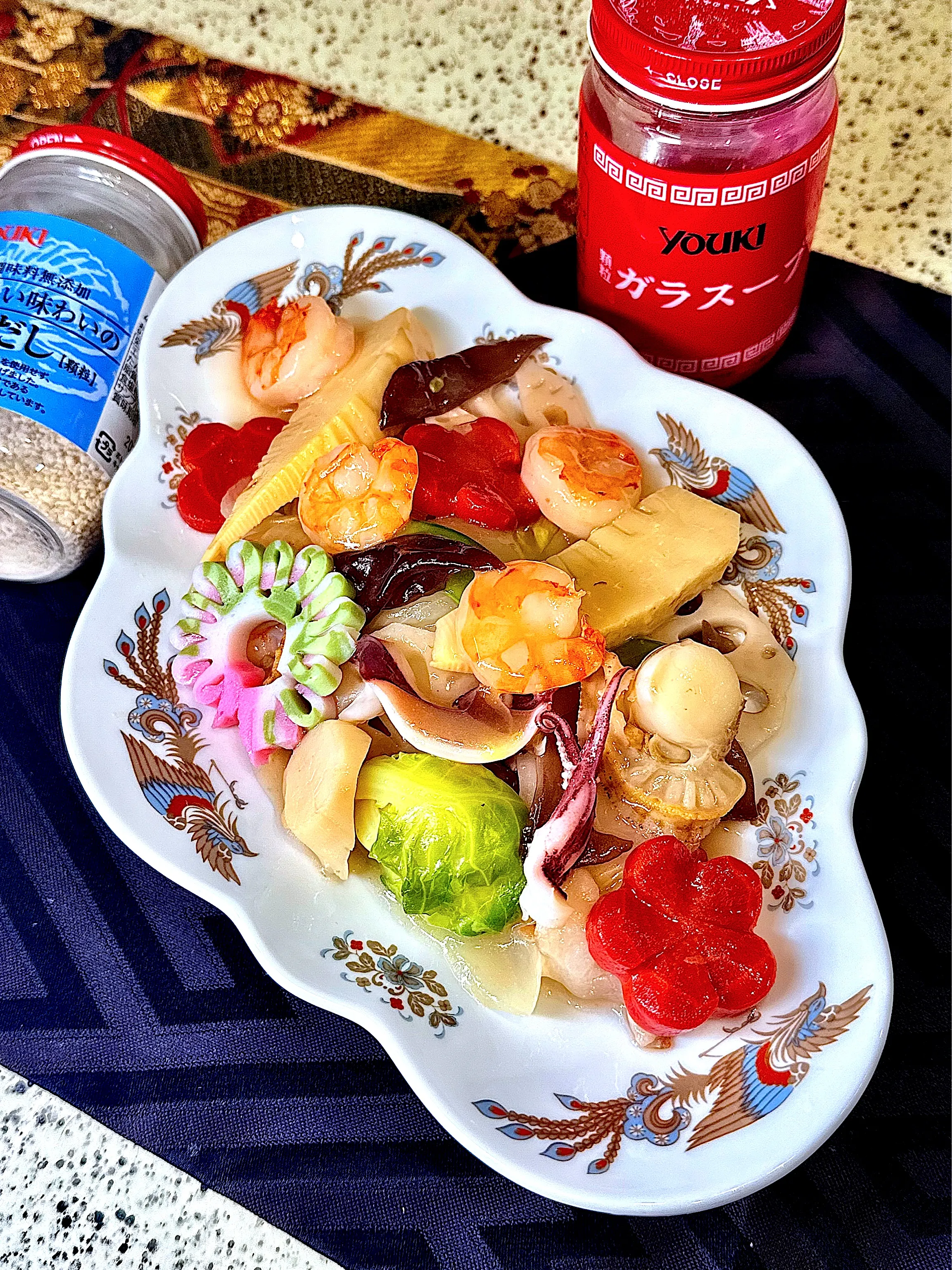 お正月用に海鮮たっぷり入れて、かまぼこも飾り切りをしました♪