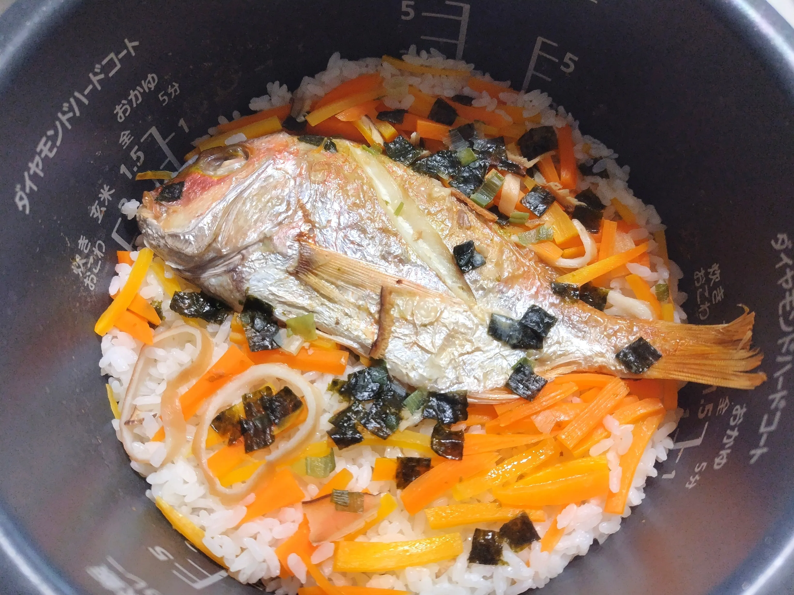 鯛めし #晩ご飯 #連子鯛 #長谷園 #お吸い物 #にんじん #炊飯器 #鯛めし