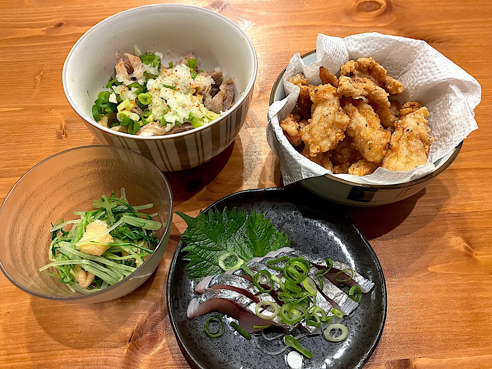 #おつまみ#ひねぽん#鯵の刺身#軟骨唐揚げ#水菜のおひたし