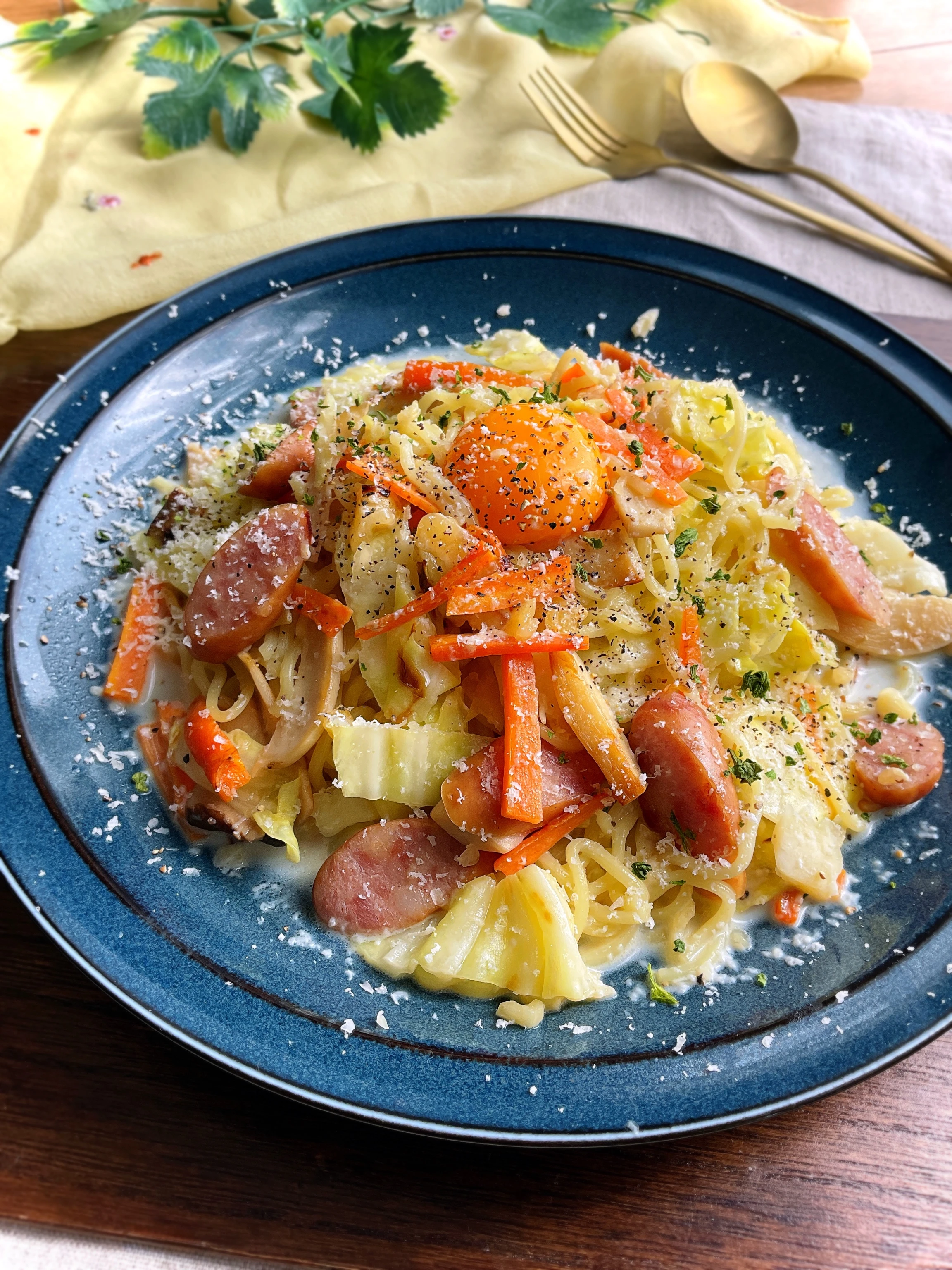 焼きそばをカルボナーラにするなんて…アイデアが( *˙ω˙*)وスバラシイワ!
